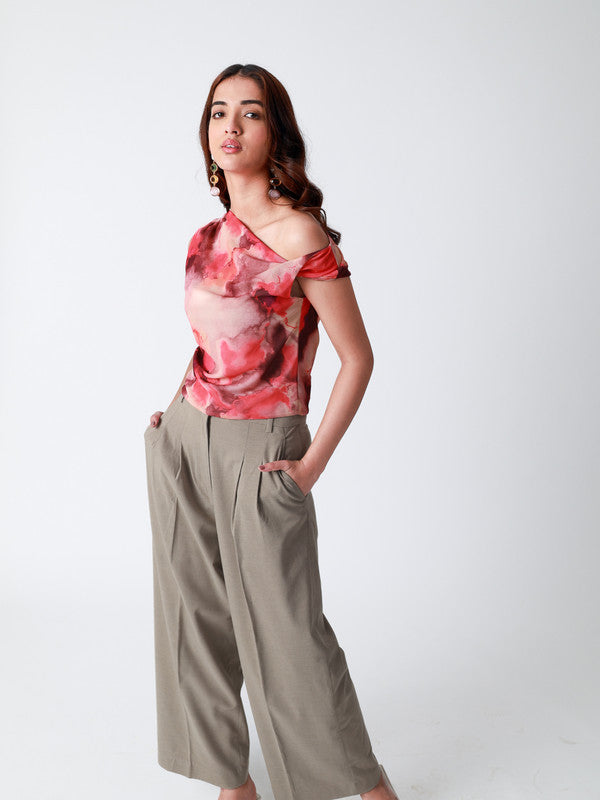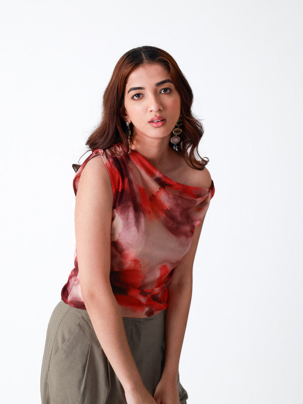 This top is a one-shoulder, asymmetrical piece in a vibrant red and pink watercolour print. The fitted silhouette and unique design add a stylish and contemporary touch. The lightweight, silky fabric drapes elegantly, making it a chic choice for both casual and semi-formal occasions.