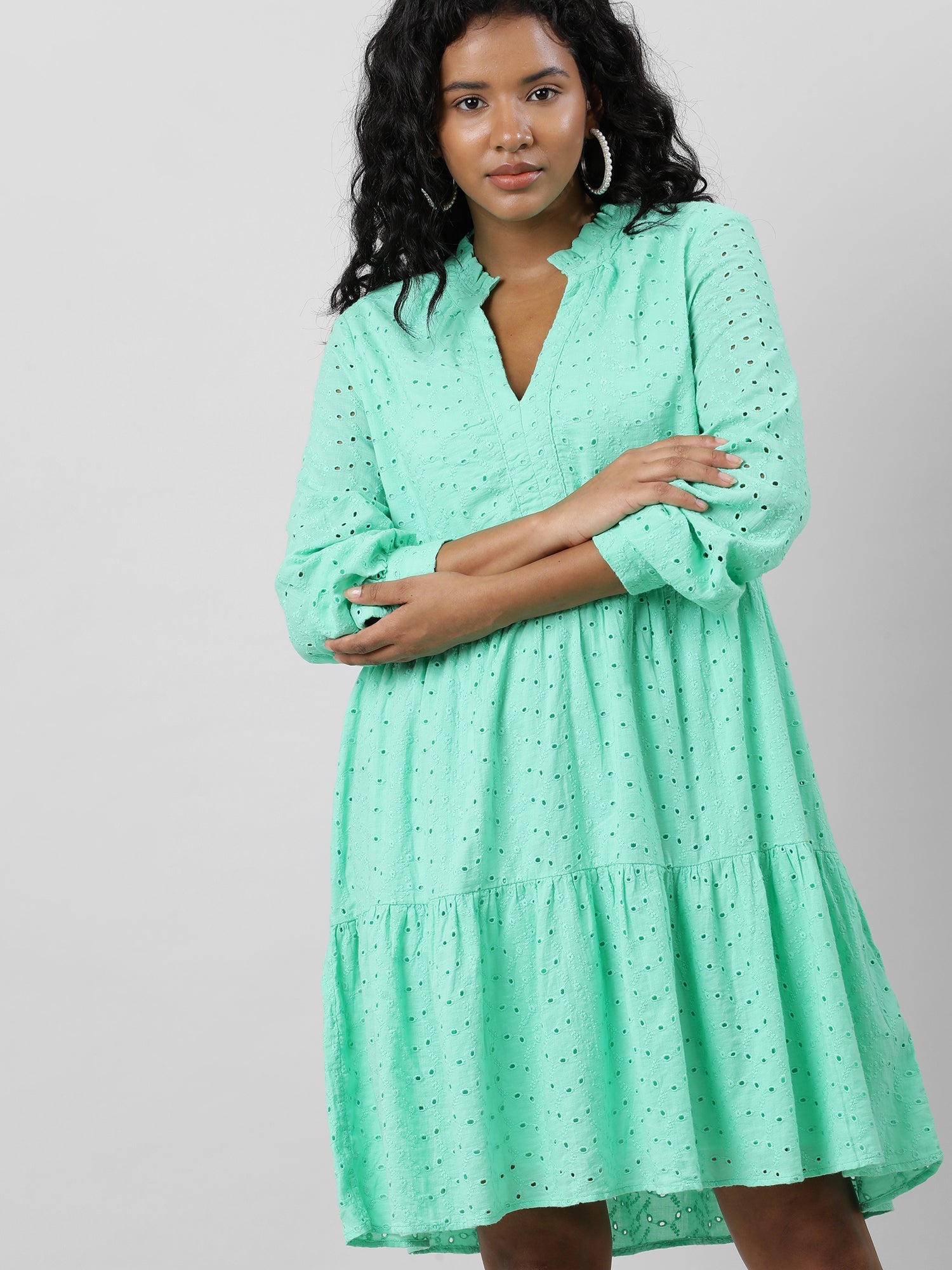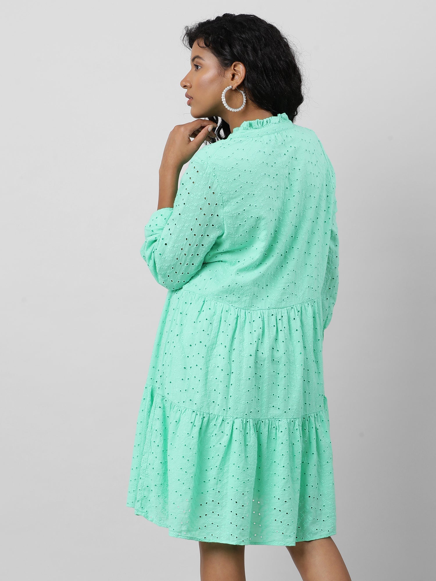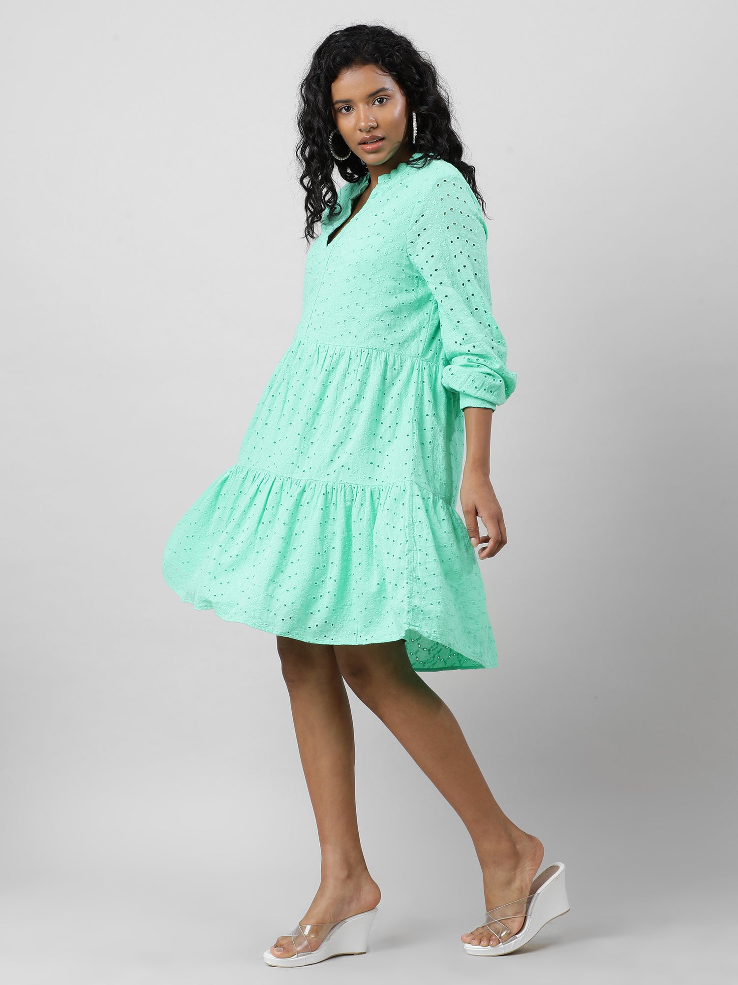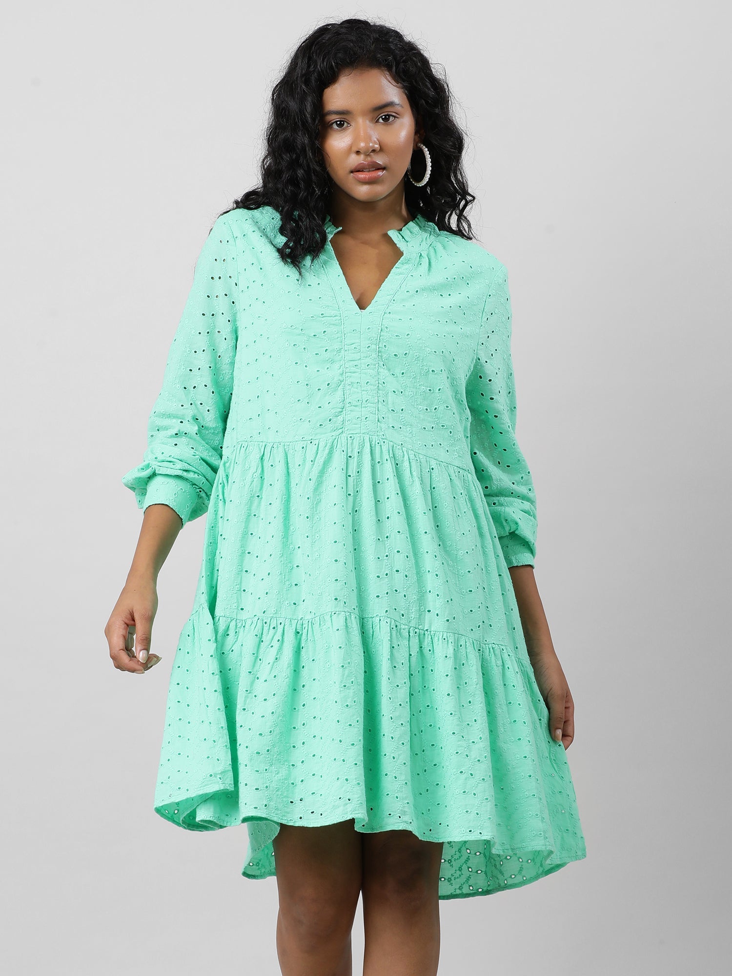 Dress to impress in our chic lace-embellished Schiffli dress. With a tiered silhouette and trendy details, it's the epitome of GenZ style.