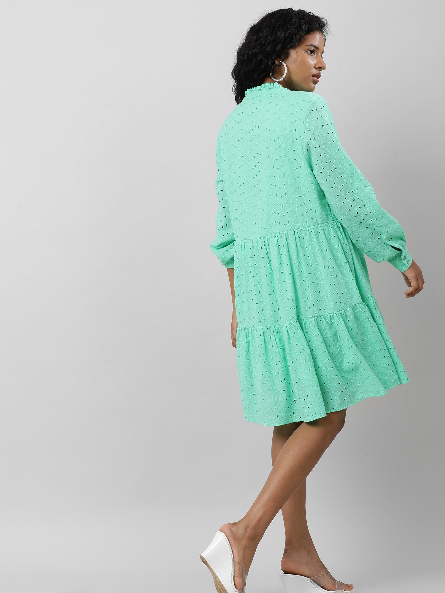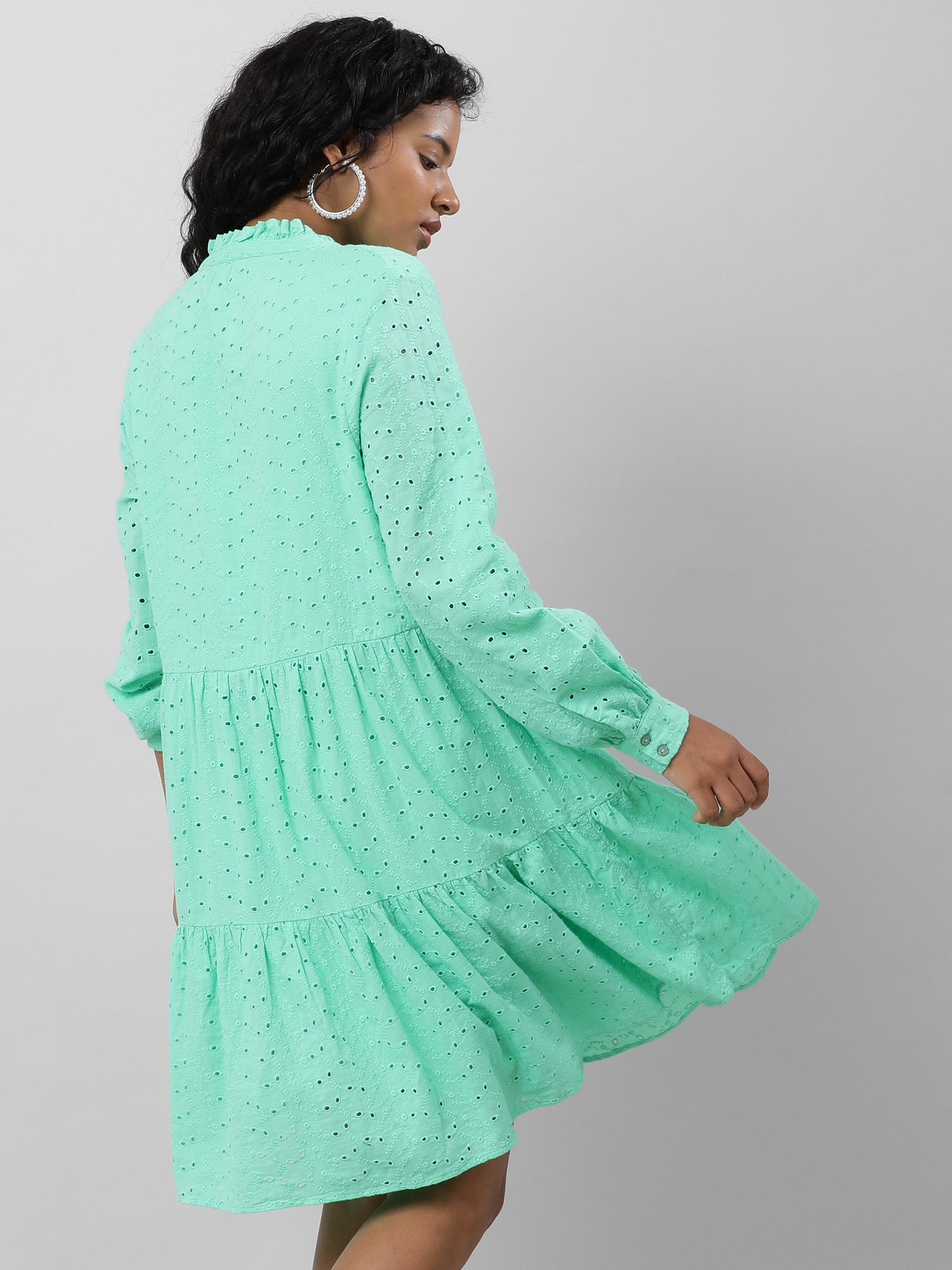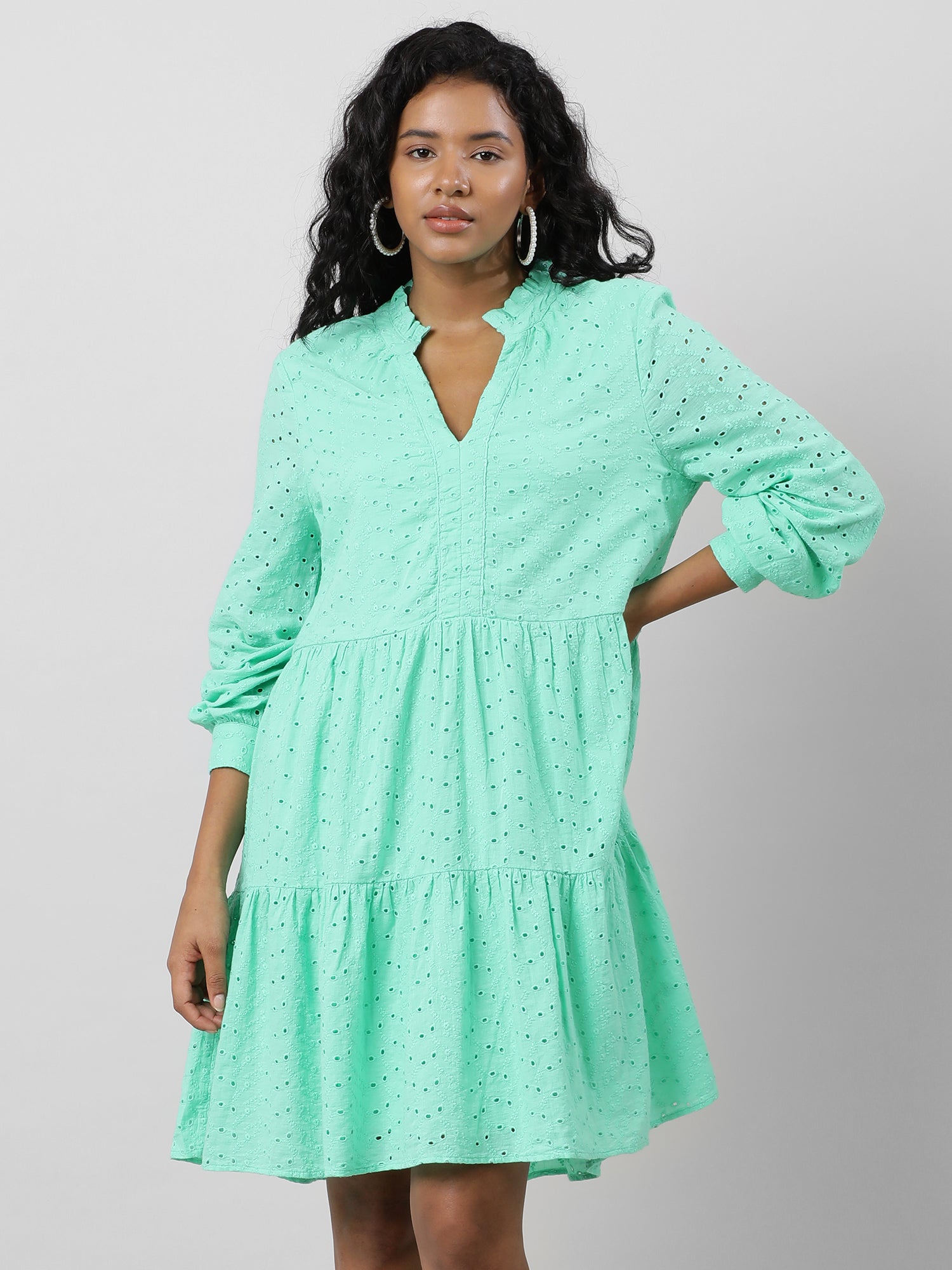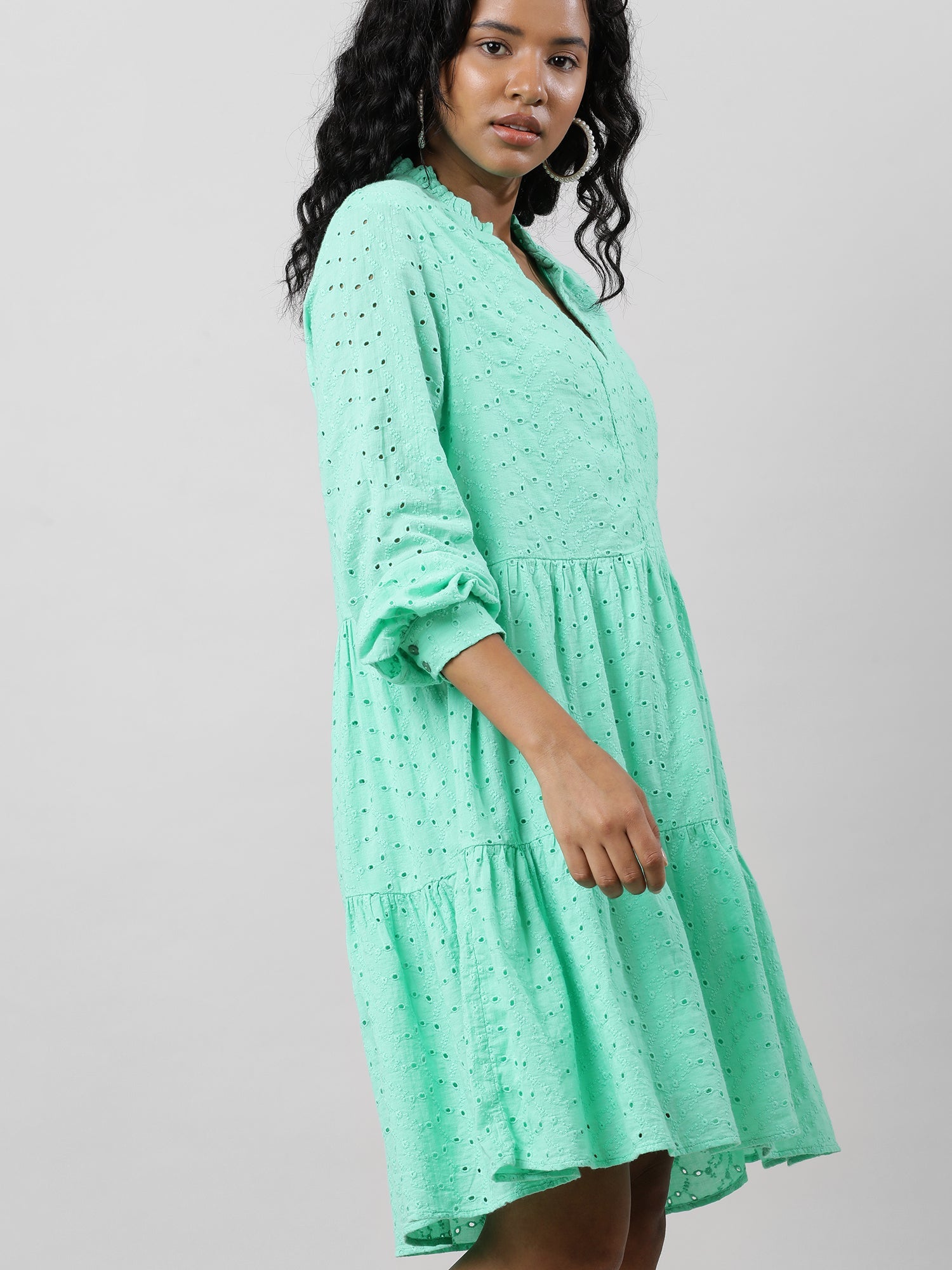 Dress to impress in our chic lace-embellished Schiffli dress. With a tiered silhouette and trendy details, it's the epitome of GenZ style.
