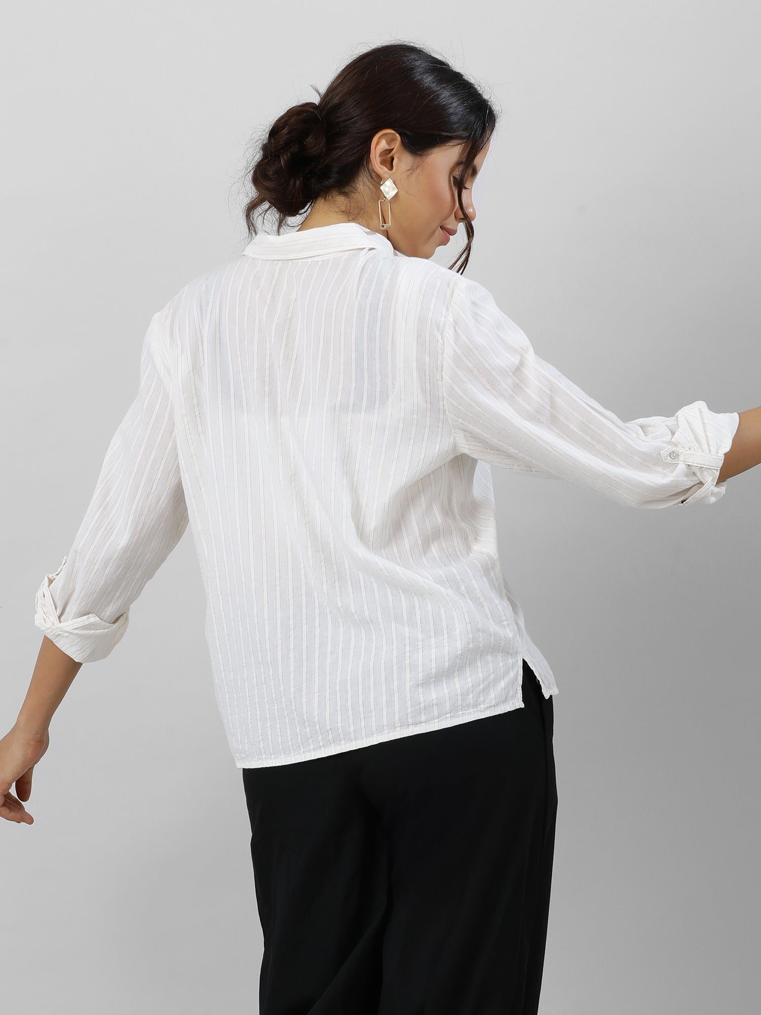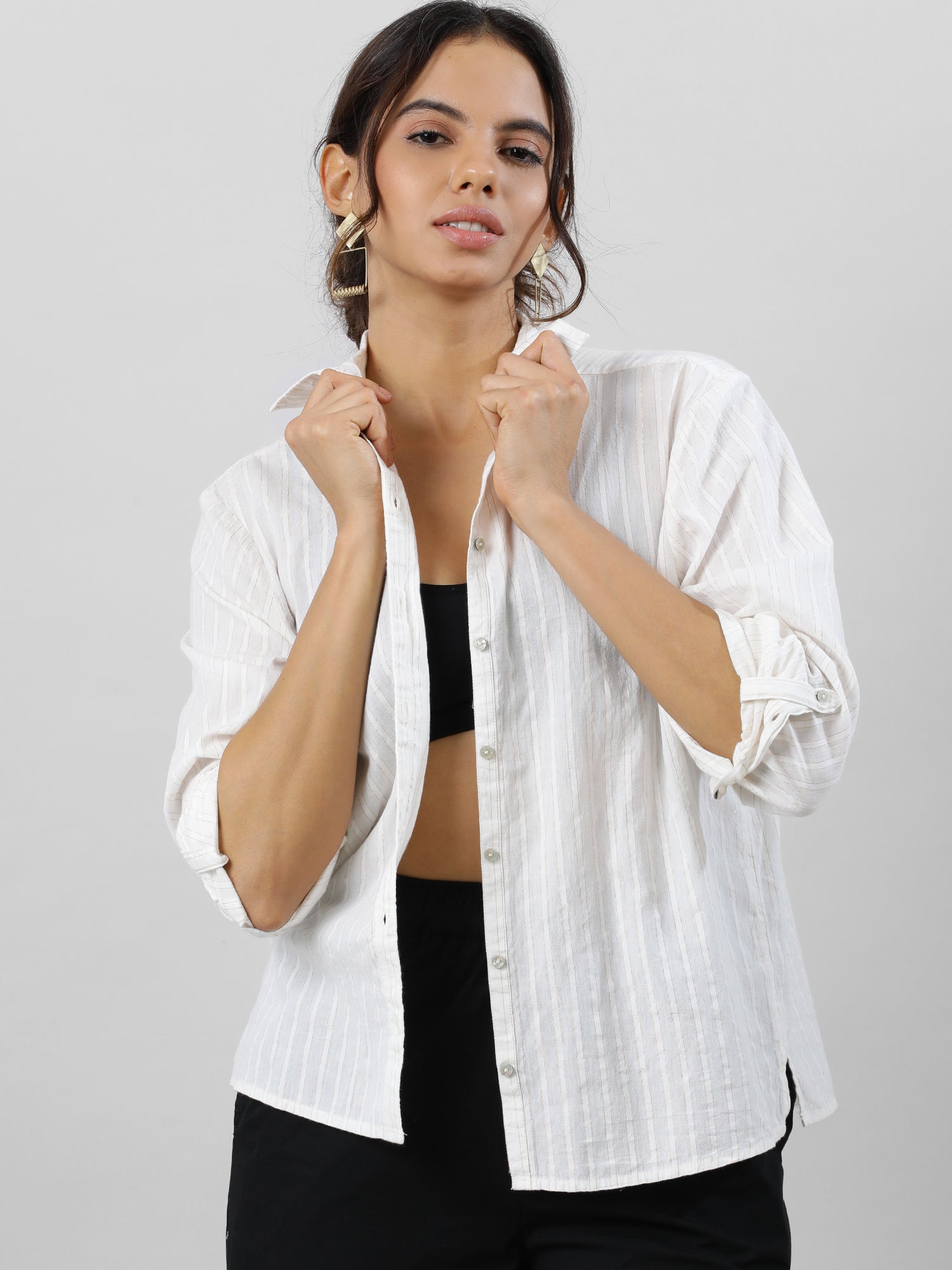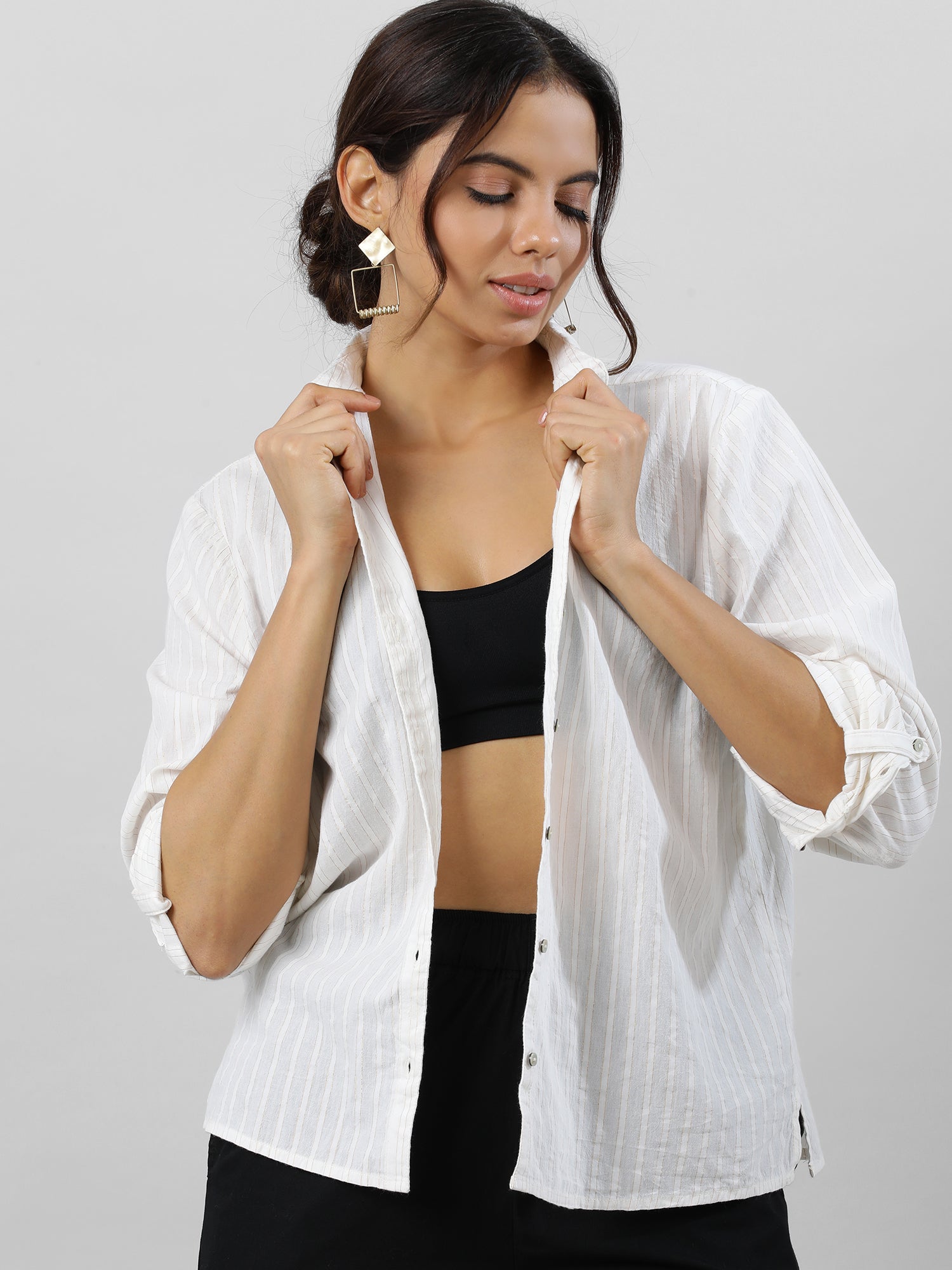 Unleash your golden vibes with our Stand Collar Shirt featuring stylish stripes. Crafted from exceptional fabric, it's your ticket to global glam
