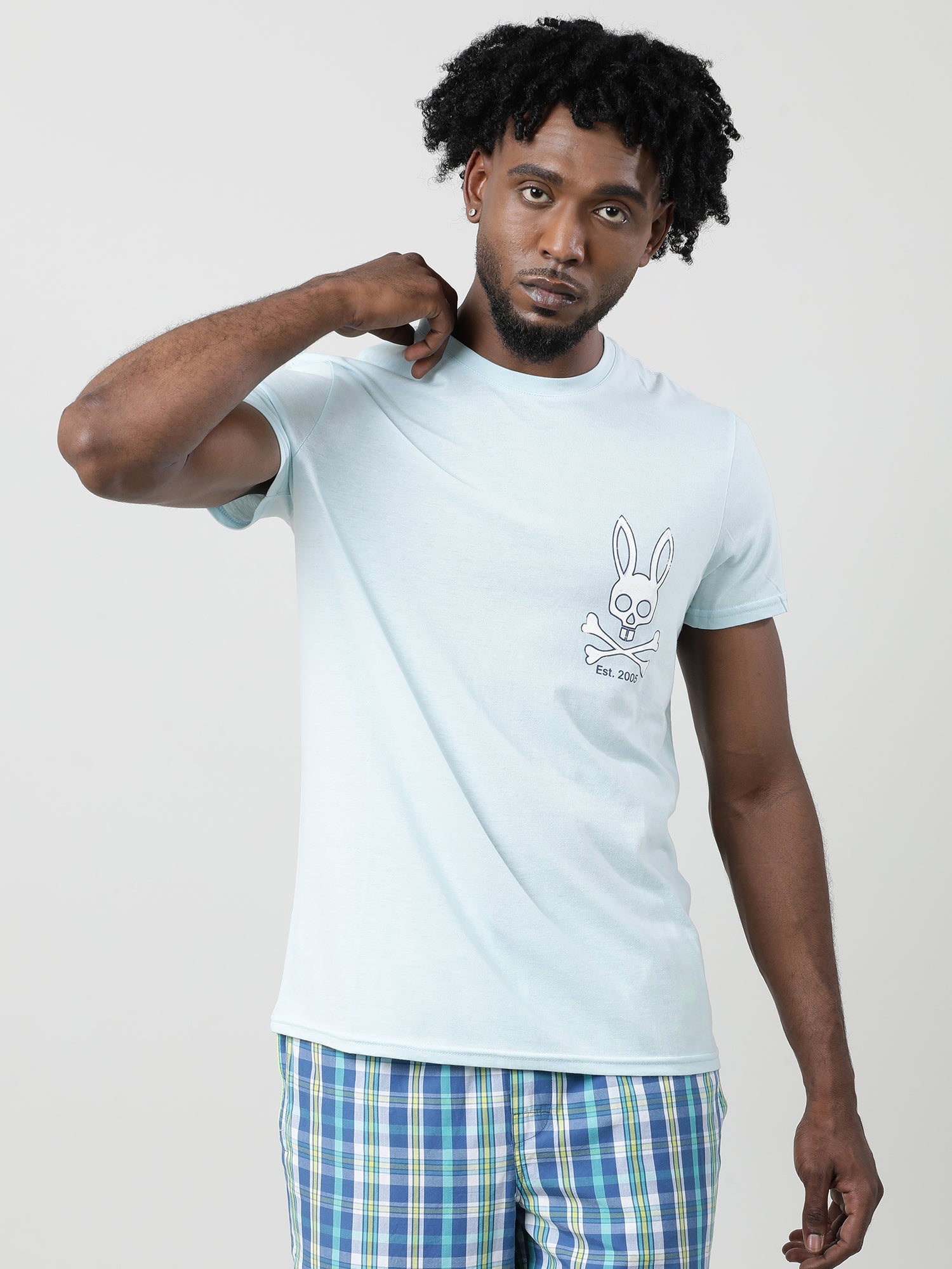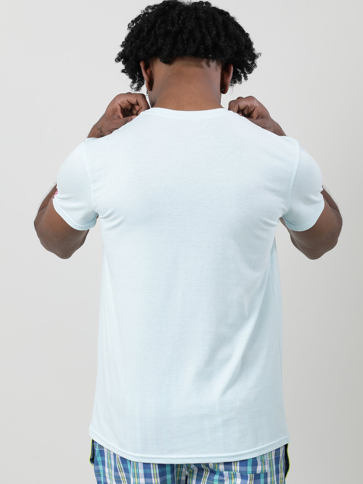 Infuse your summer wardrobe with personality in our light blue round-neck tee, adorned with a playful graphic print and designed for all-day comfort and style.