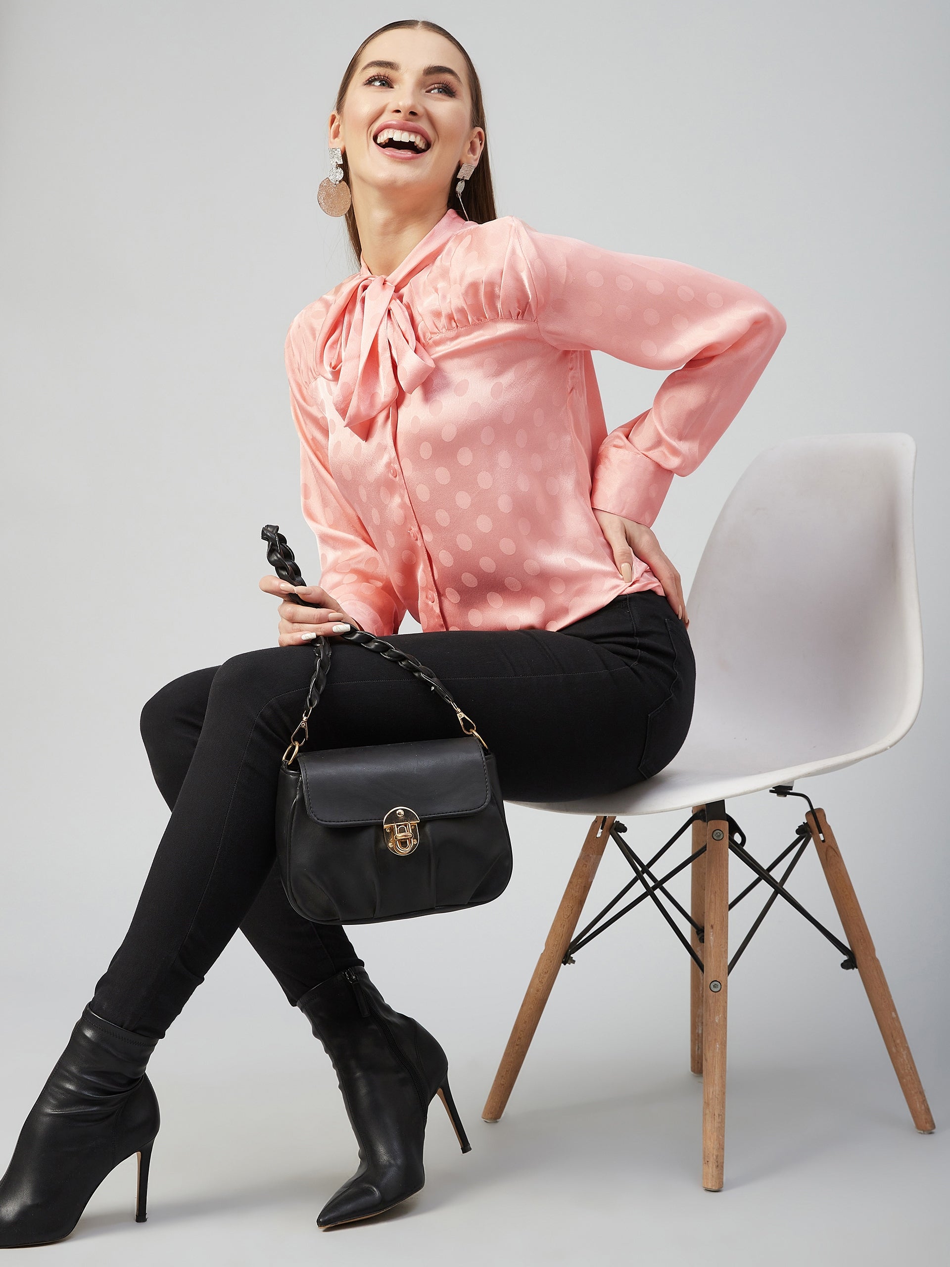 Peach woven casual self design regular top, has a tie-up neck, long sleeves, self design, cuffed sleeves, regular length