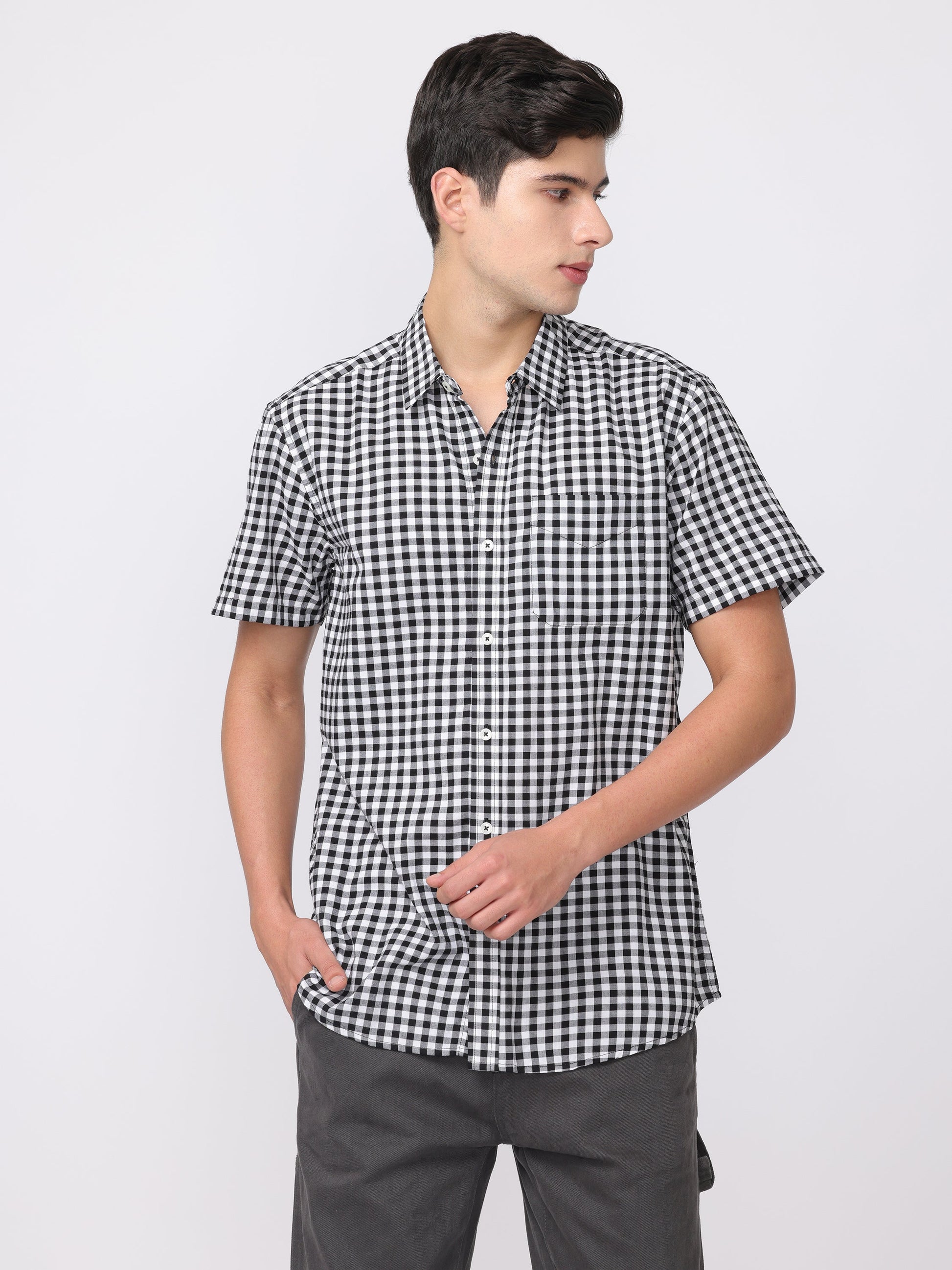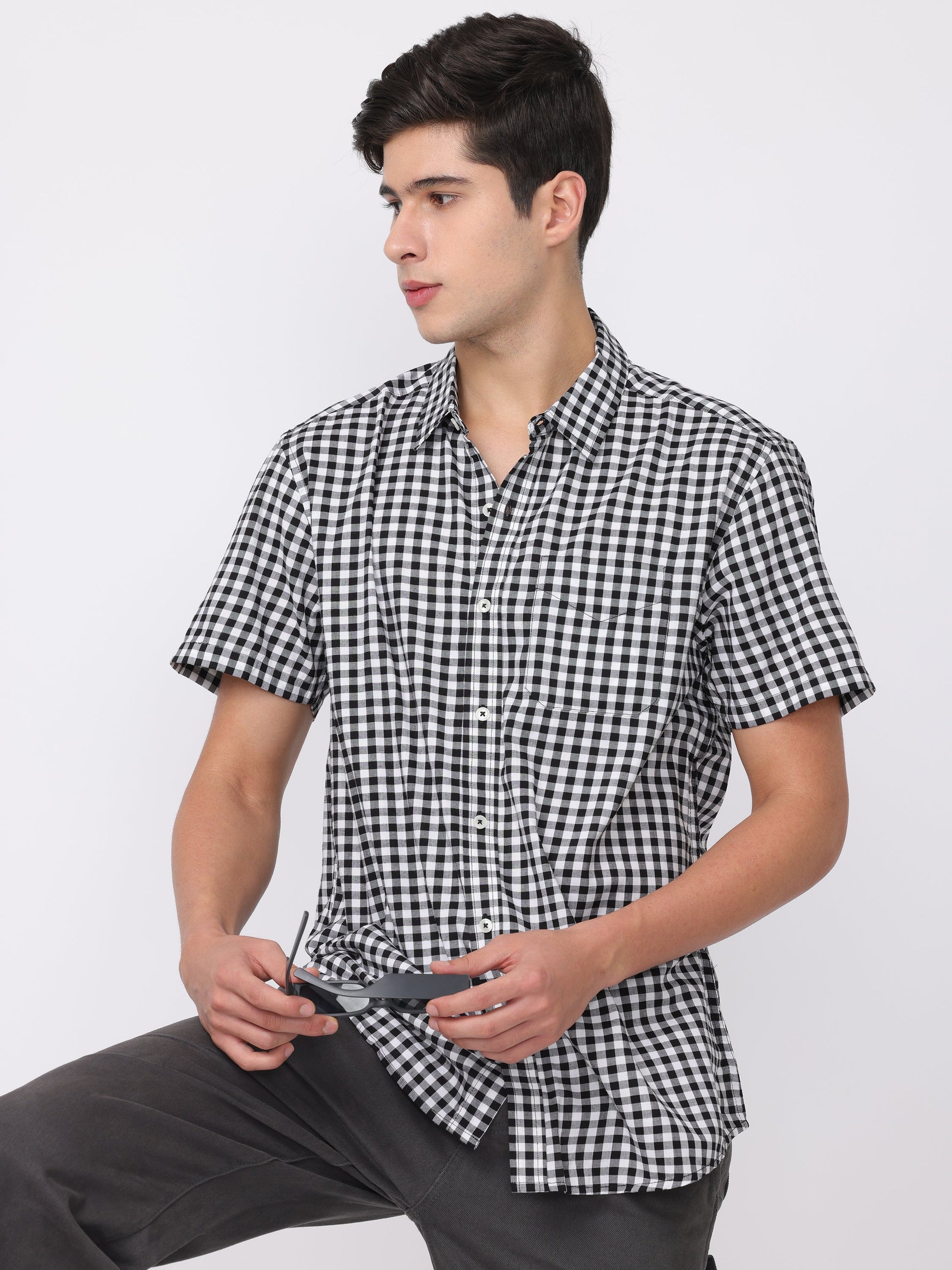 This Men Black Regular Fit Checked Shirt features a textured fabric with a classic checked pattern, offering style and comfort. Designed with half sleeves, a shirt collar, and a front pocket, it’s perfect for casual and semi-formal occasions.