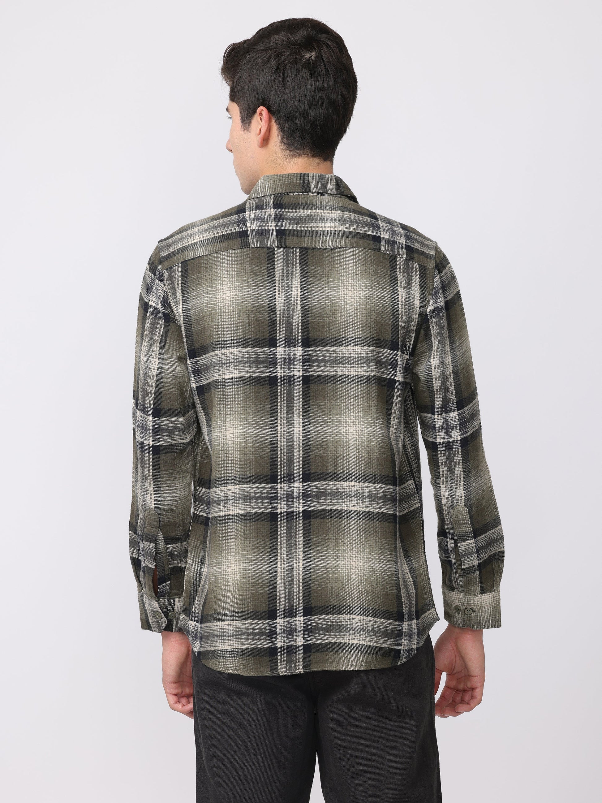 This Men Olive Regular Fit Checked Brushed Shirt features a textured fabric with a classic checked pattern, offering both comfort and style. Designed with full sleeves, a shirt collar, and a front pocket, it’s perfect for both casual and semi-formal occasions.