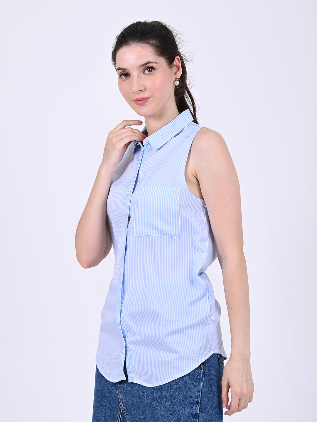 NoBarr women smart casual sleeveless striped shirt style top. Striped, Sleeveless shirt with shirt Collar, Button Down. Made of 100% Viscose