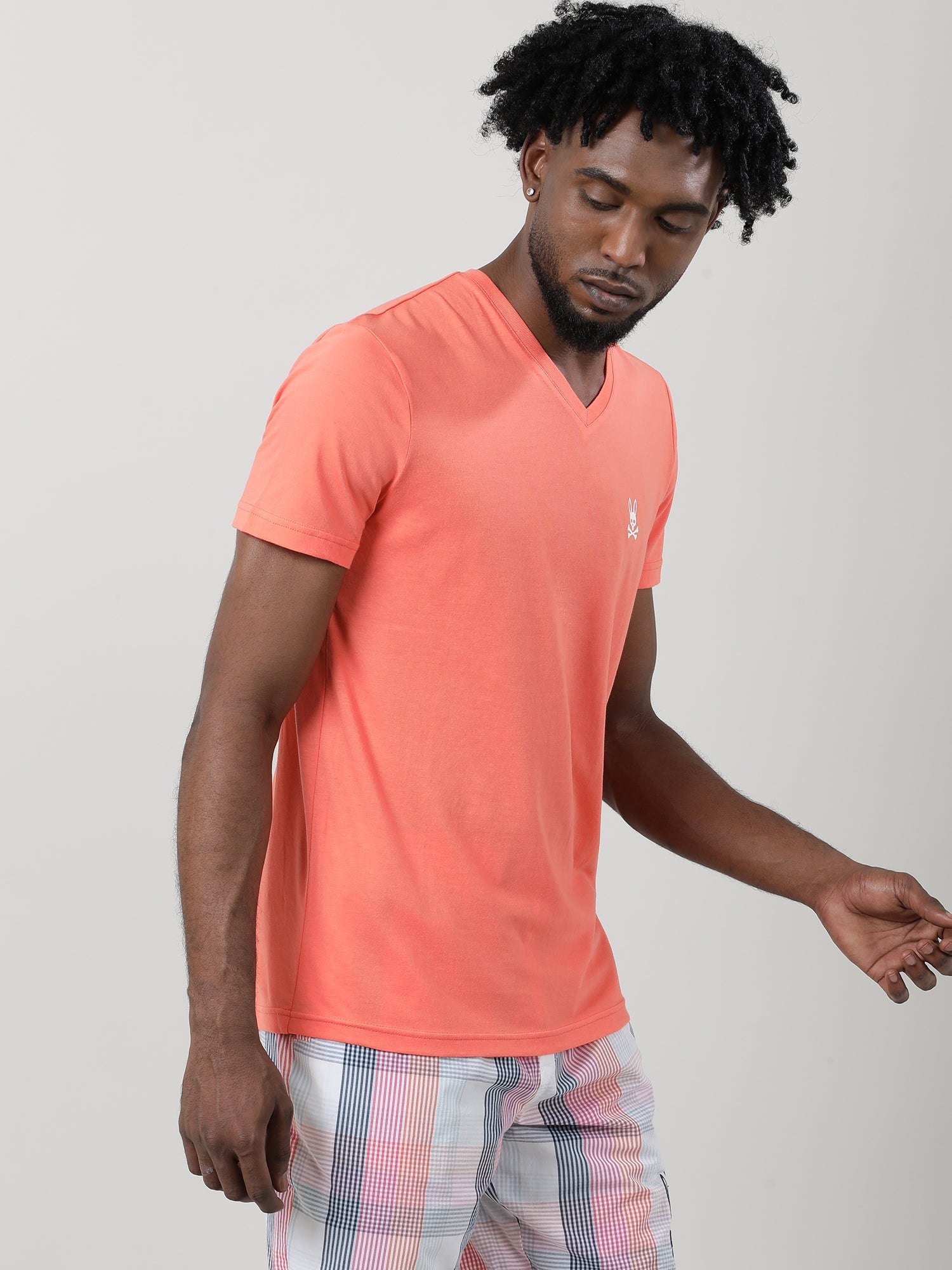 Bright orange tee with bold logo print, adding vibrancy and style to casual outfits with a trendy V-neck design.