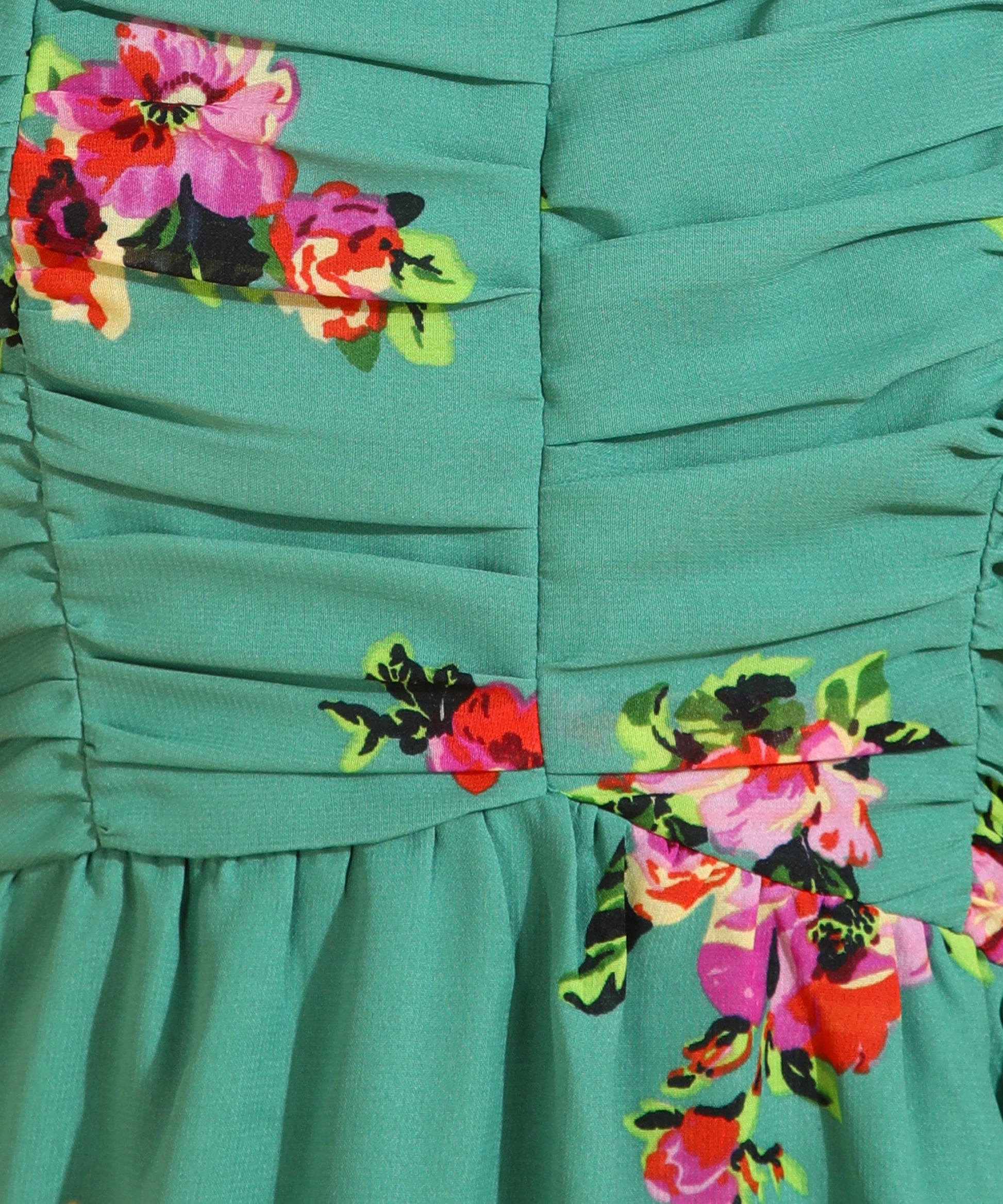 Green floral above knee a-line dress, has a sweetheart neck, short sleeves, puff sleeves, straight hem