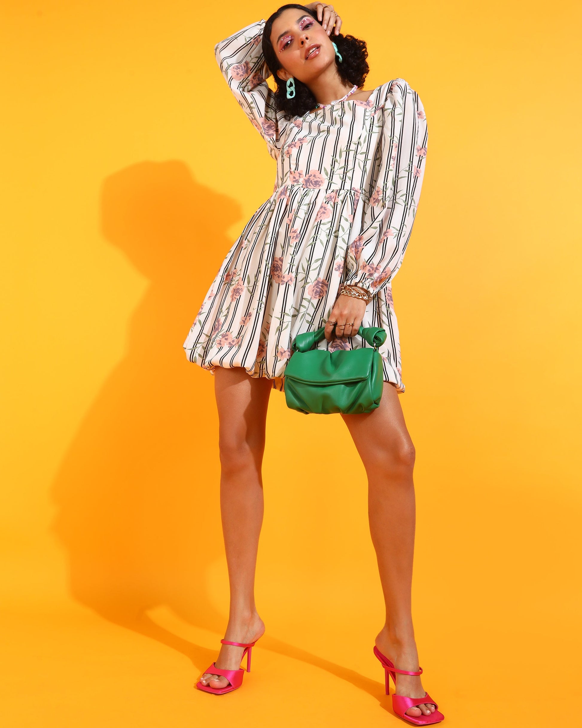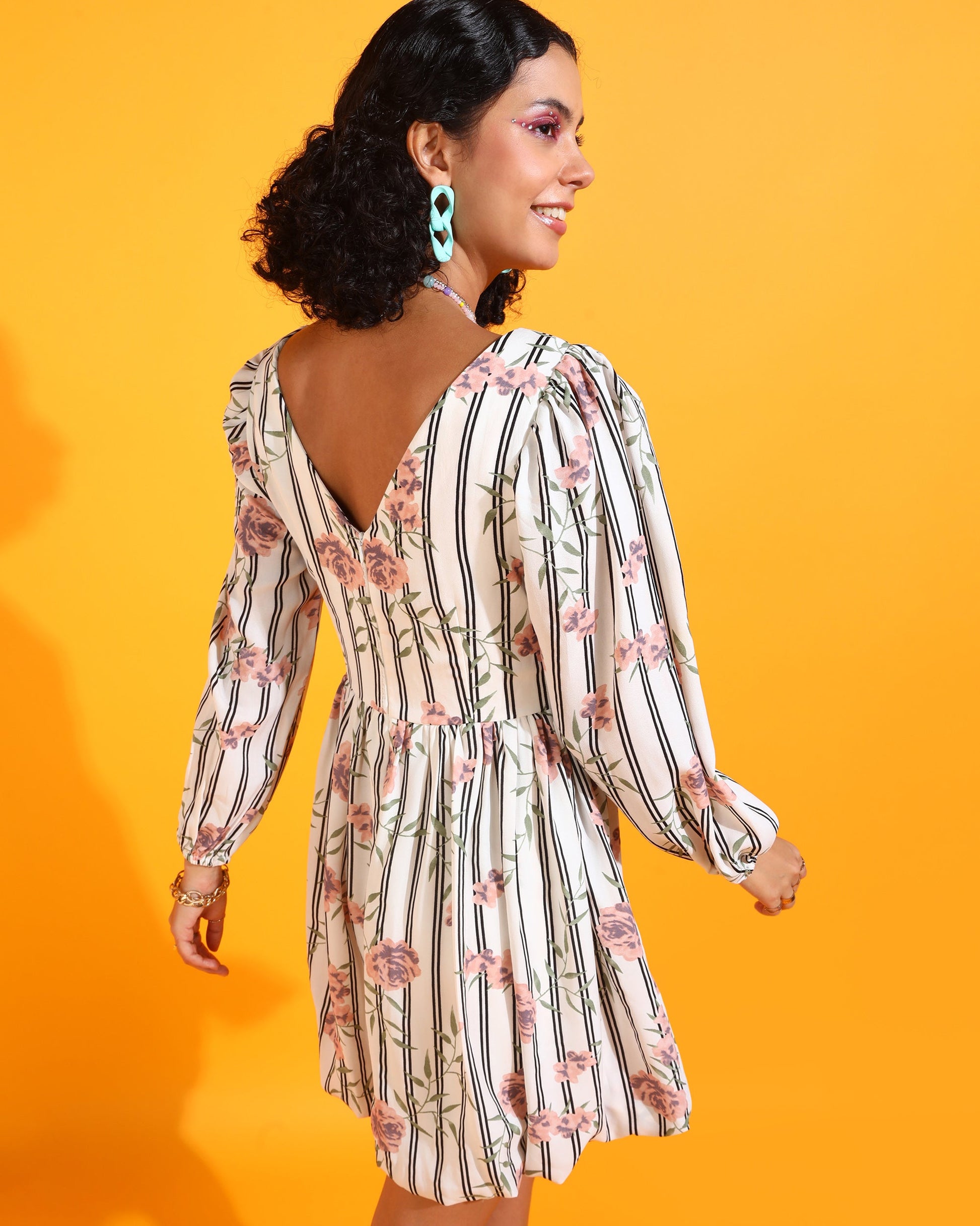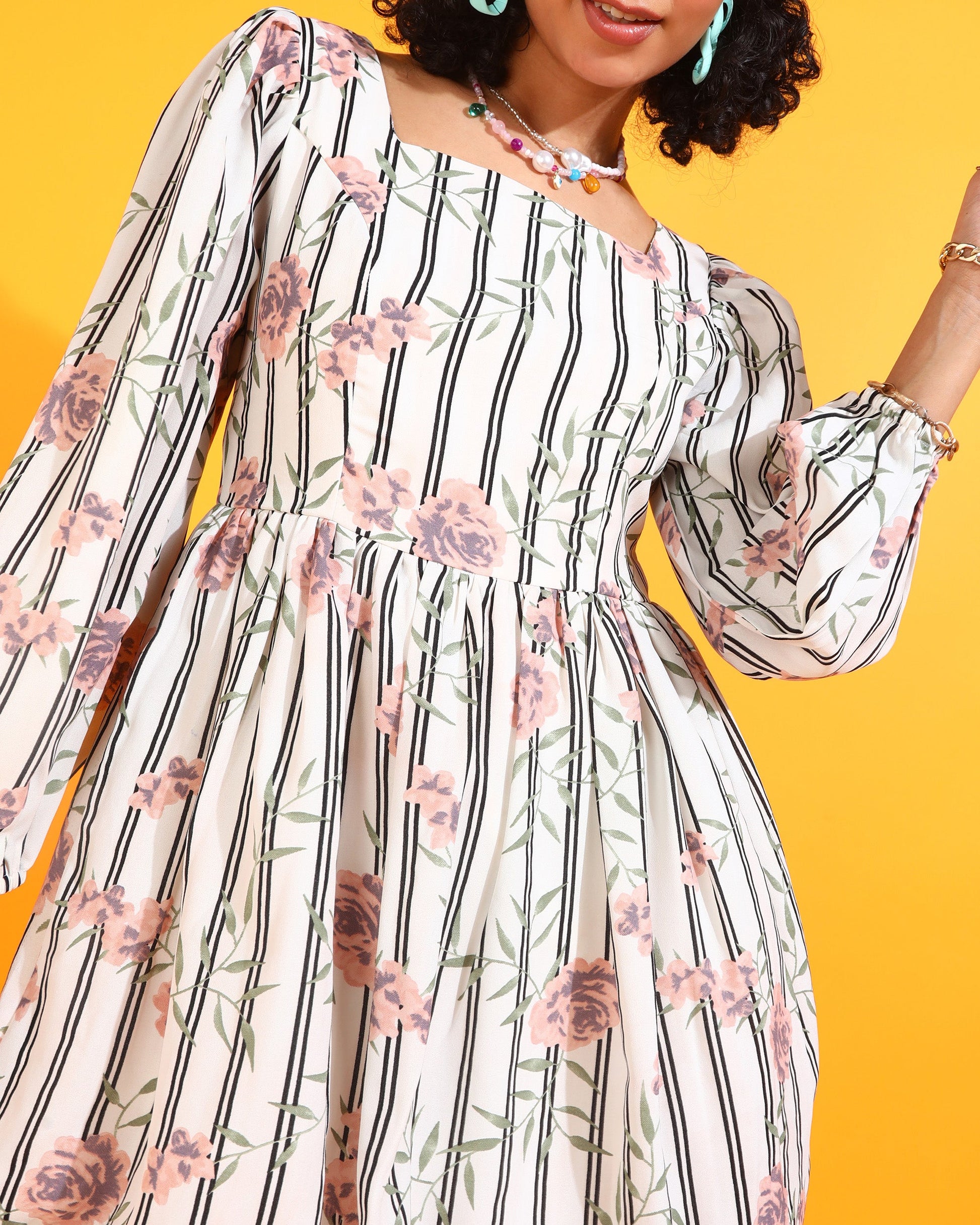 Off white floral above knee fit and flare dress, has a square neck, long sleeves, puff sleeves, flared hem