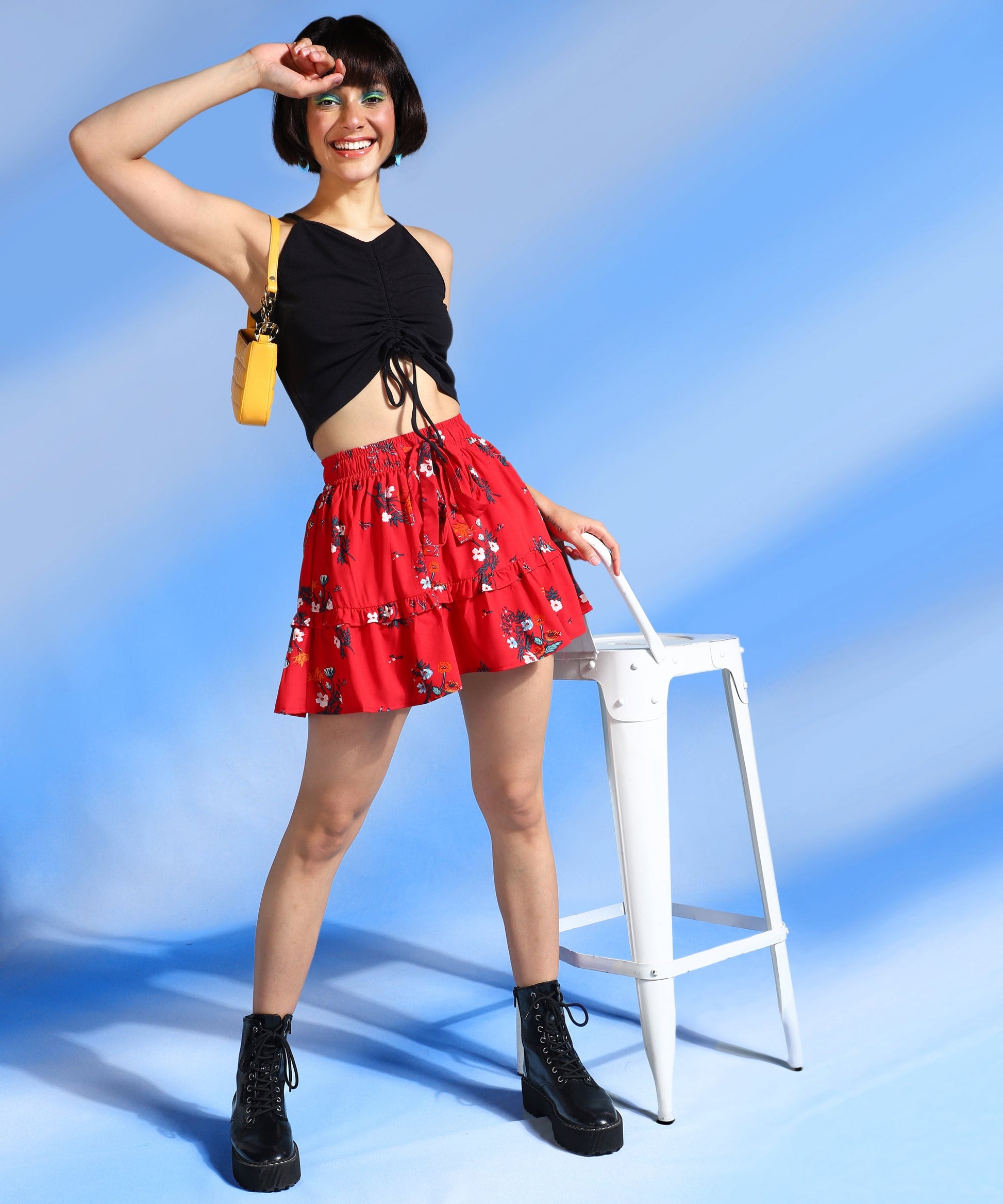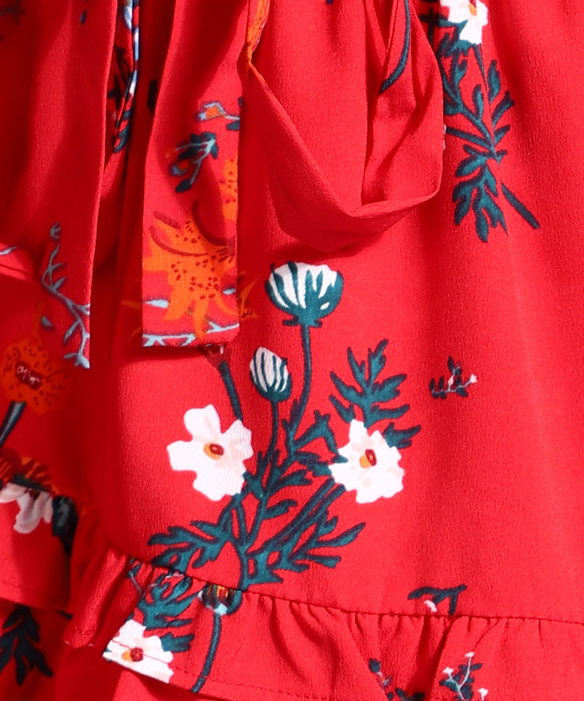 Red, navy blue, and white floral print mini skirt has ruffles, tiered. comes with an elasticated waistband with slip on closurer with tie-ups