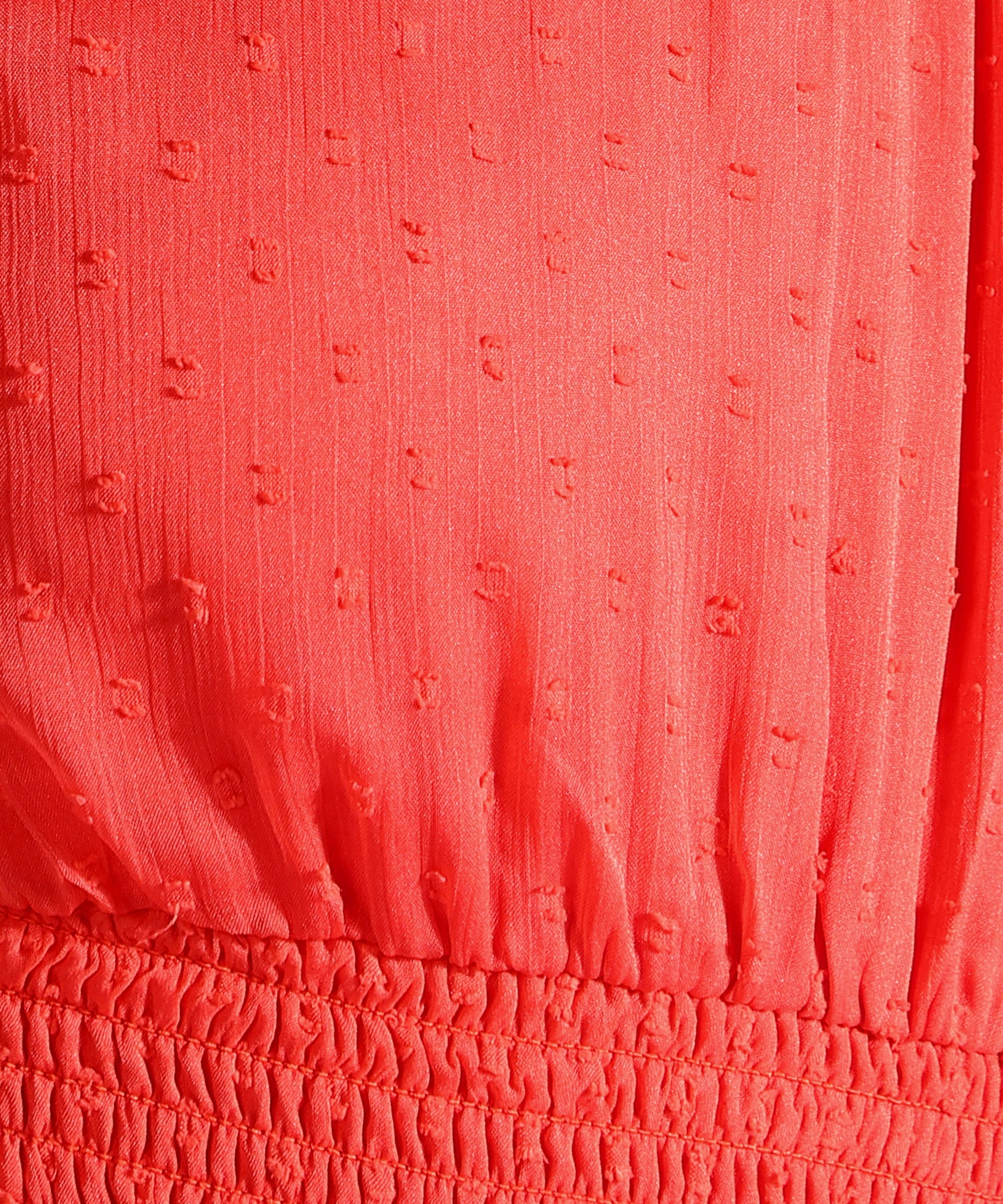 Coral woven casual self design cinched waist top, has a round neck, sleeveless, self design, no sleeves, crop length