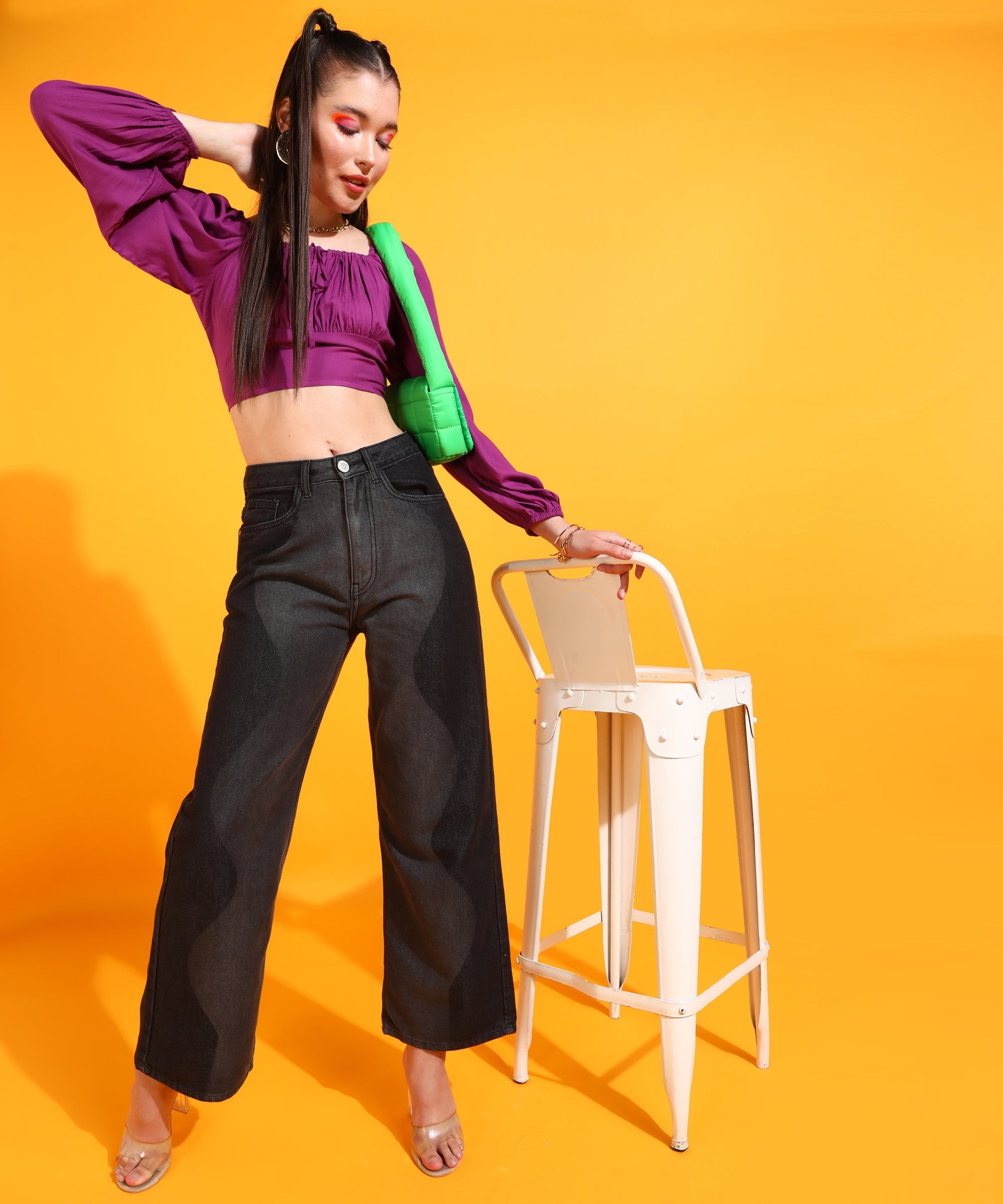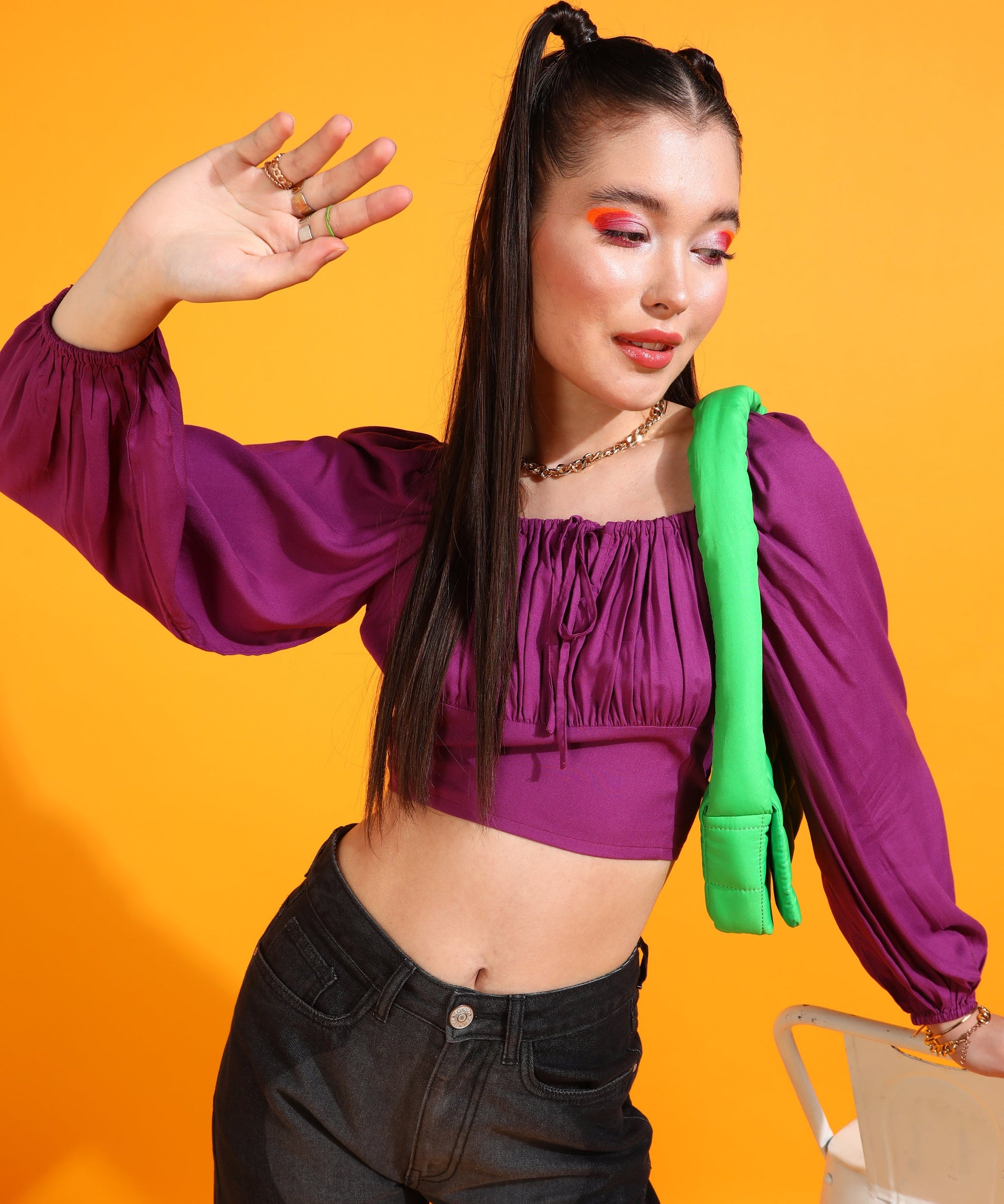 Purple woven casual solid fitted top, has a square neck, long sleeves, solid, puff sleeves, crop length