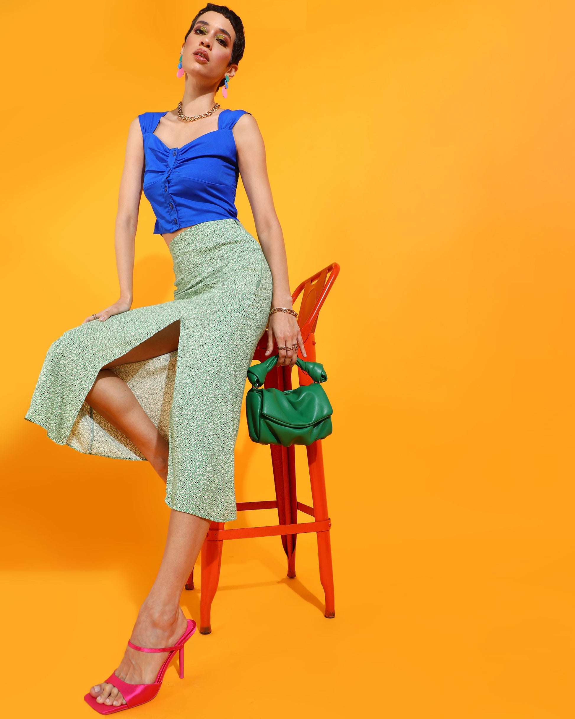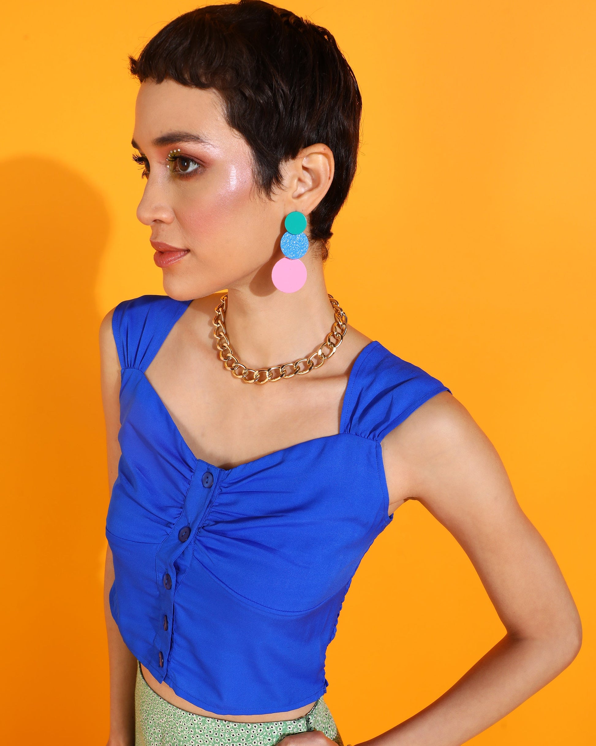 Royal blue woven casual solid regular top, has a sweetheart neck, sleeveless, solid, shoulder straps, crop length