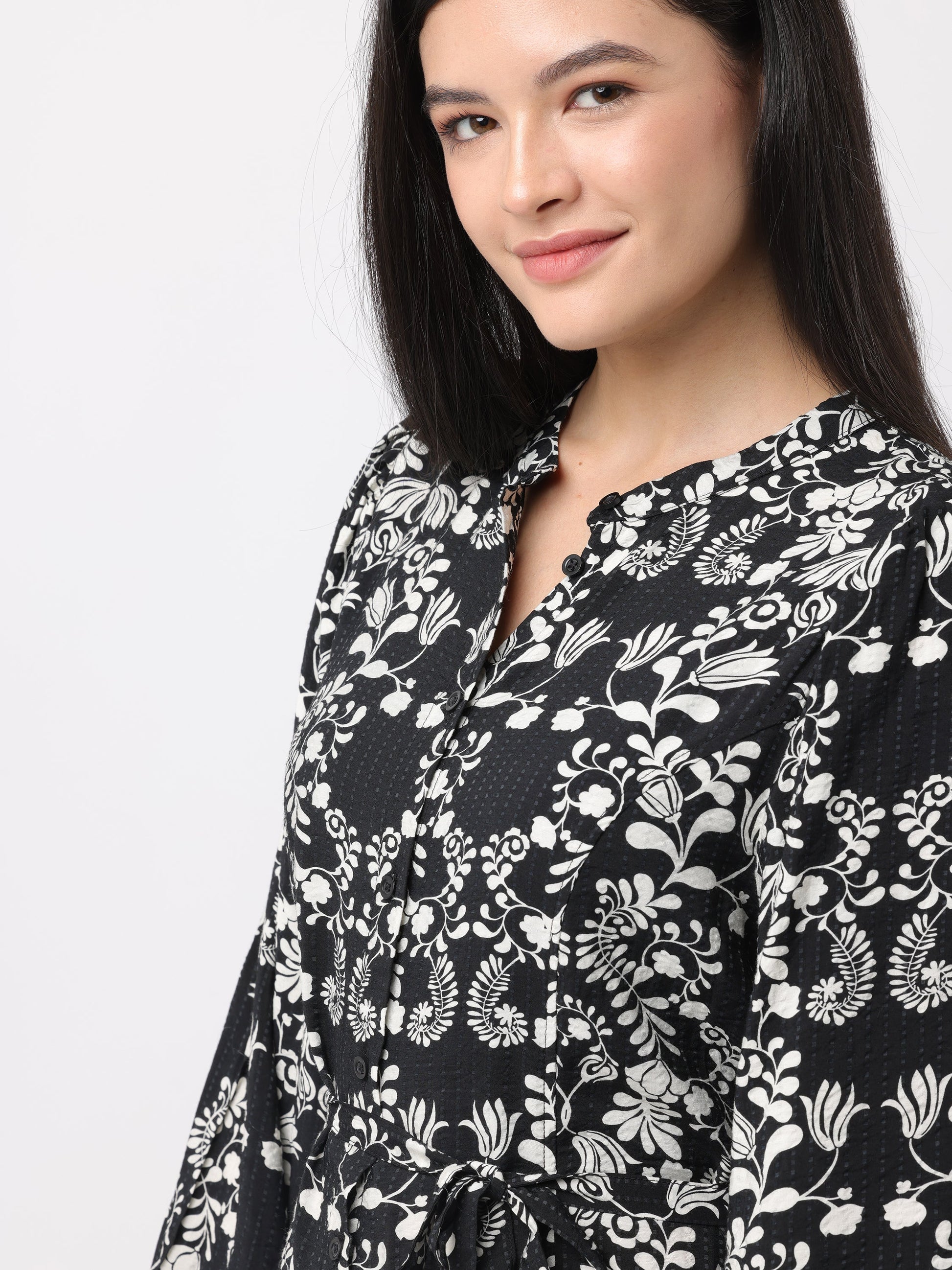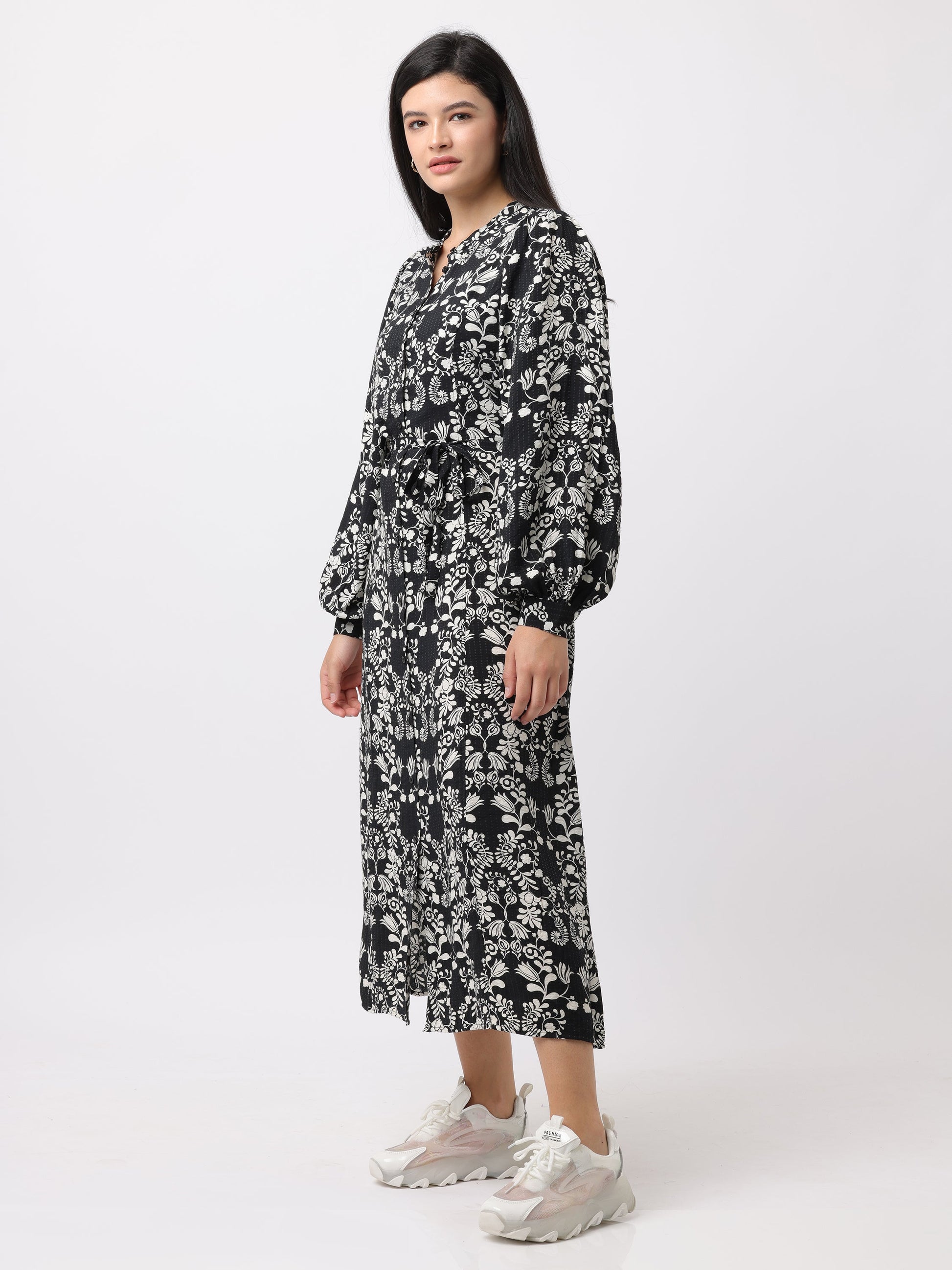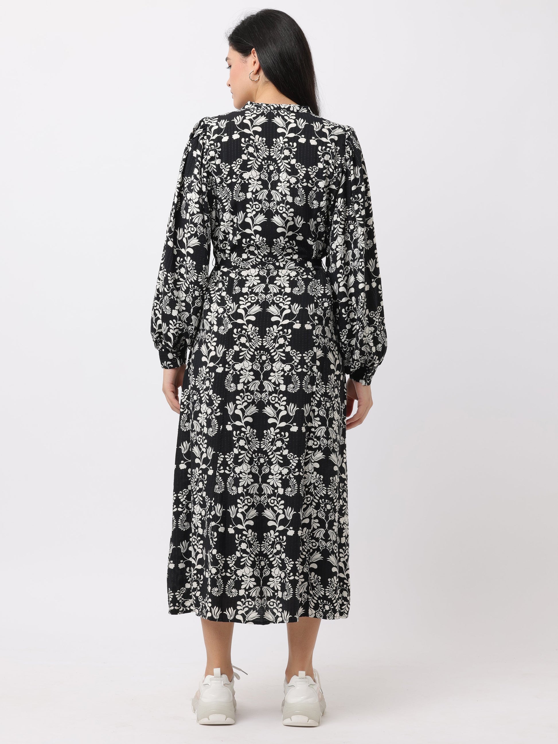 Explore the chic women’s black & white printed midi dress, perfect for both casual and formal events.