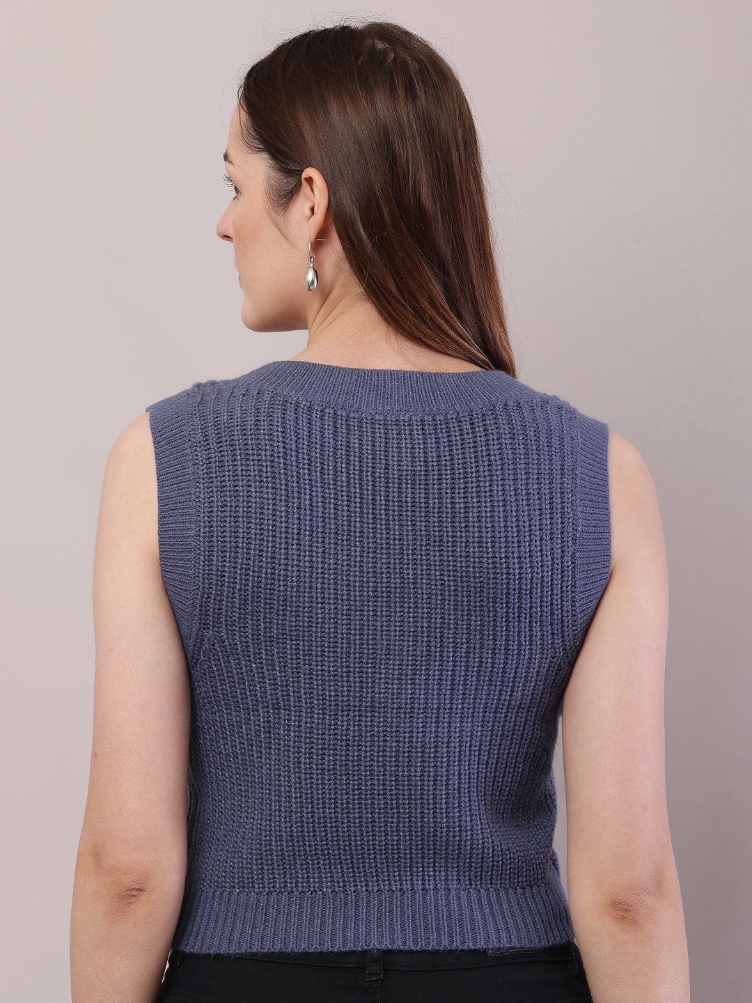 Women Blue Acrylic Sleeveless V-Neck Cable Knit Sweater