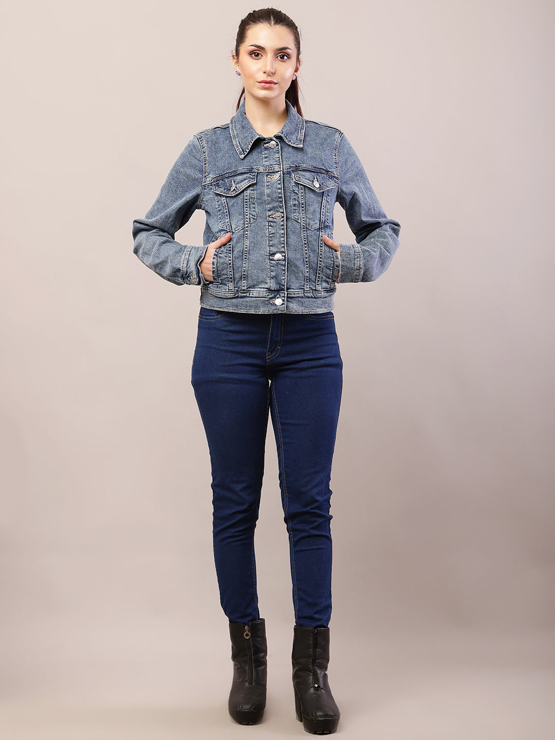 Layer up in style with the NoBarr Women's Blue Denim Shirt Collar Jacket—your go-to for all things casual chic.