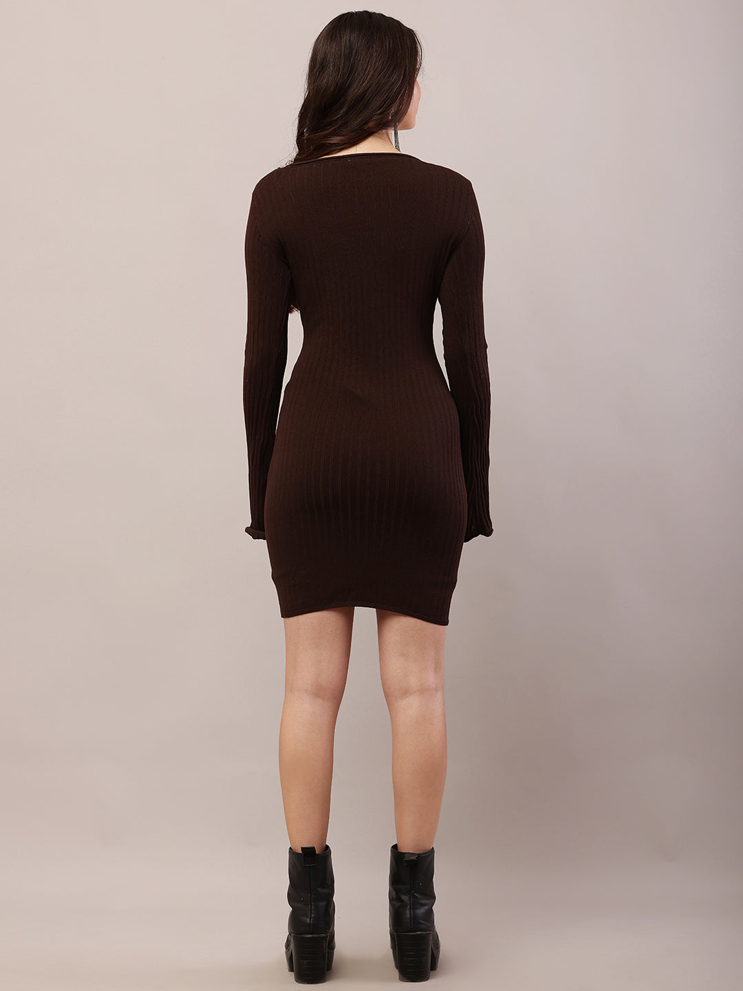 Women brown viscose ribbed full sleeve bodycon dress