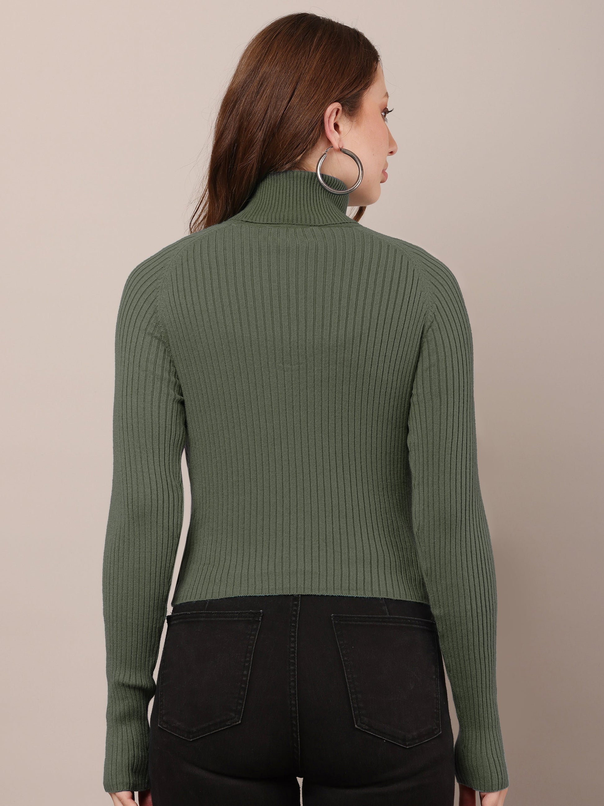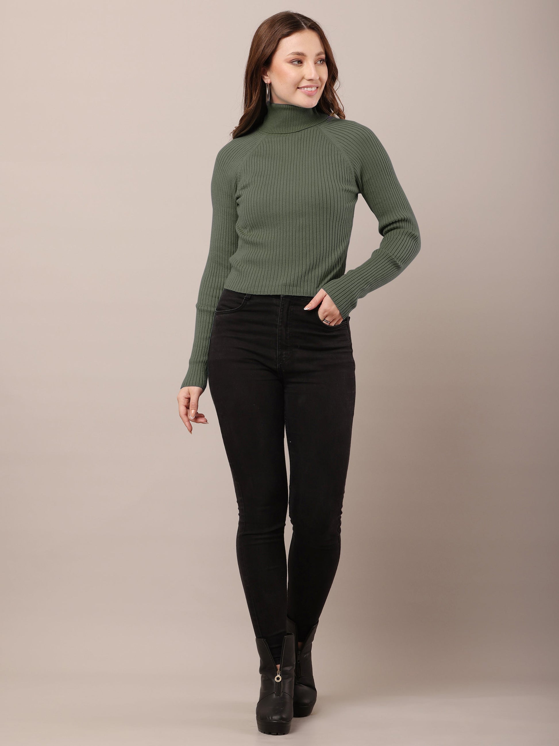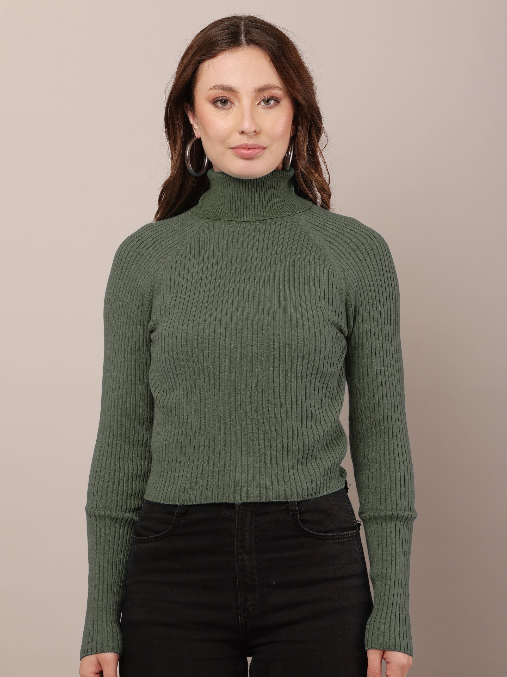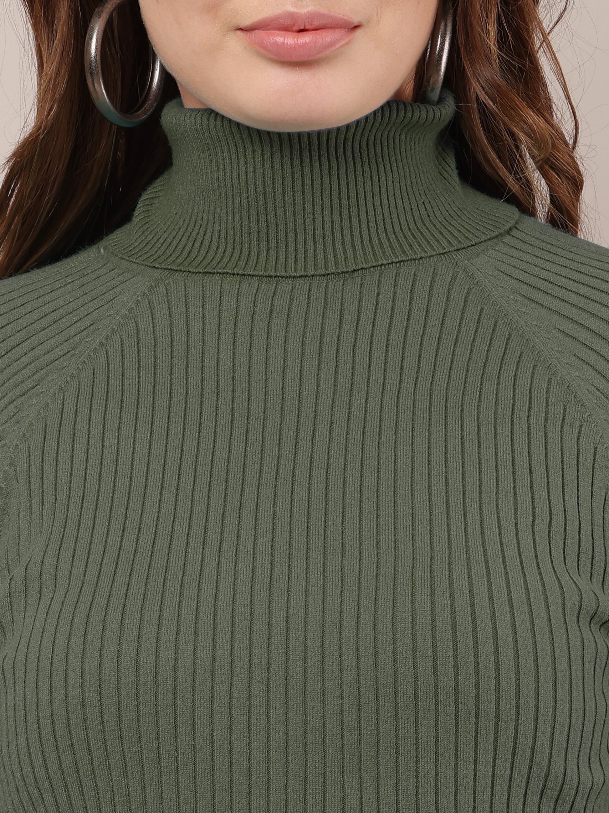 Women dark green cotton raglan high-neck sweater
