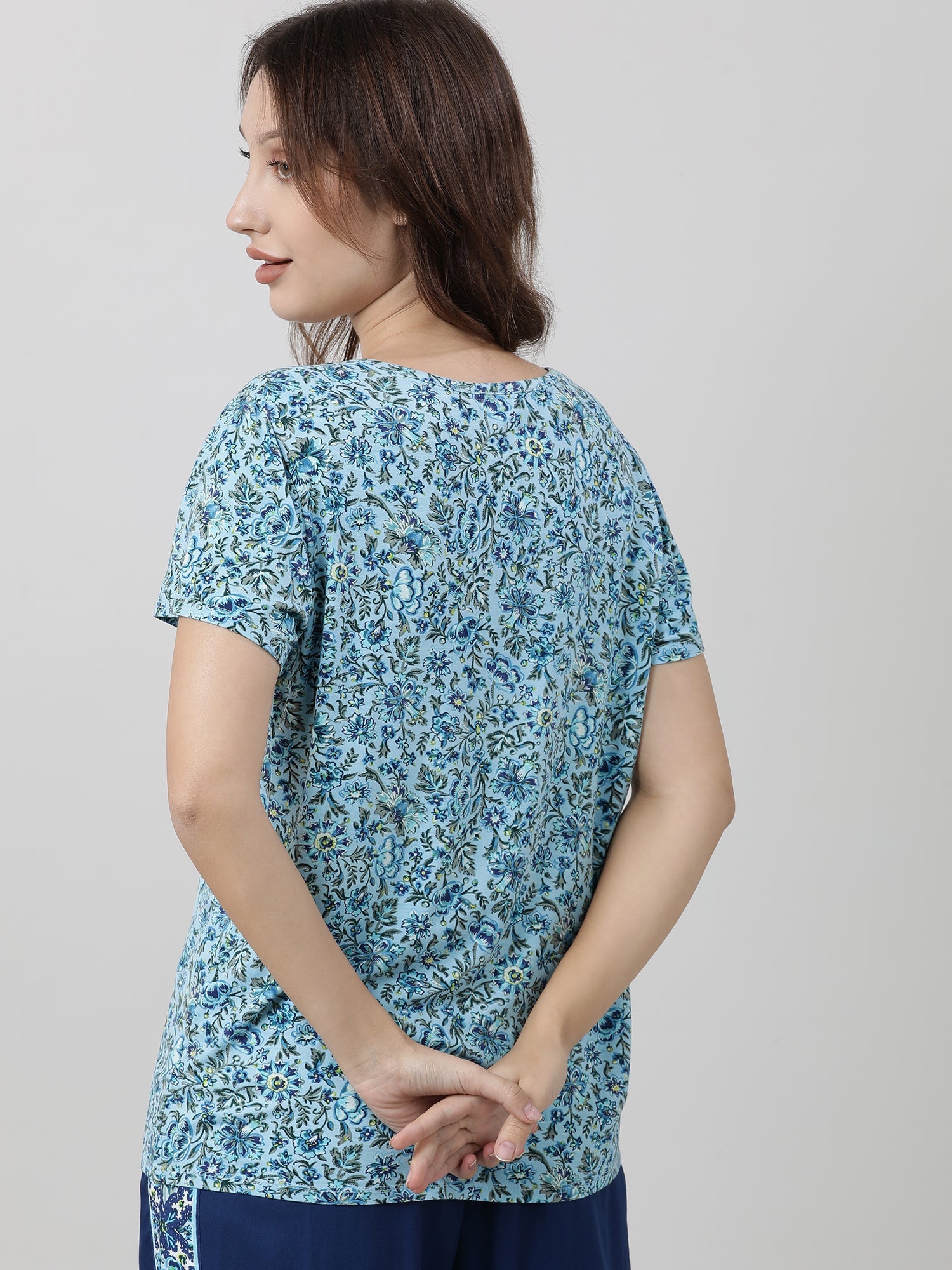 A stylish floral print blue round-neck tee with short sleeves, effortlessly versatile for any casual occasion and easy styling.