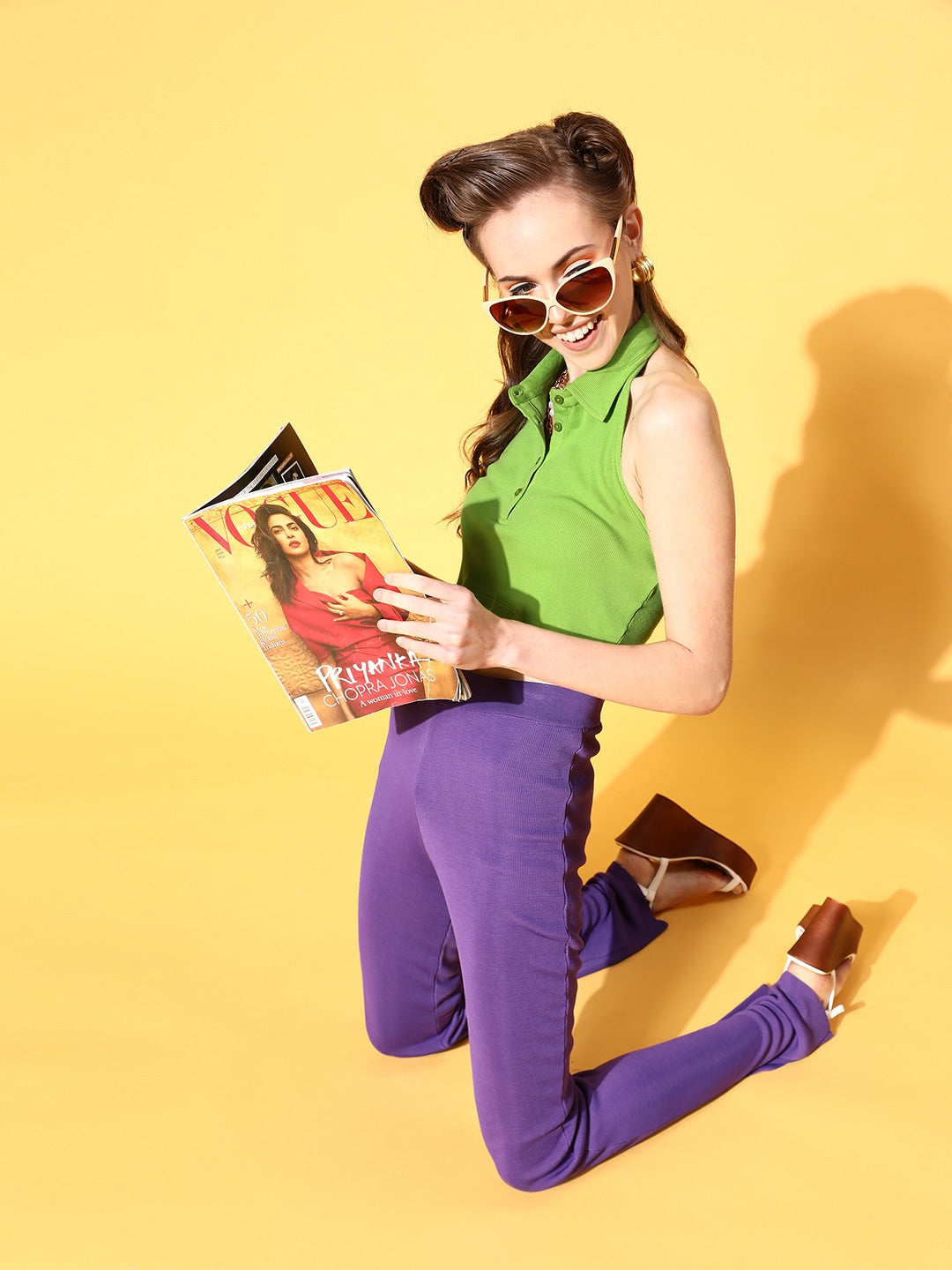 Green Polo Halter Crop T-Shirt, in Rib fabric, Unlined, Crop Length, Slim Fit, Button Closure, Straight Hemline and features Button Detail At Front