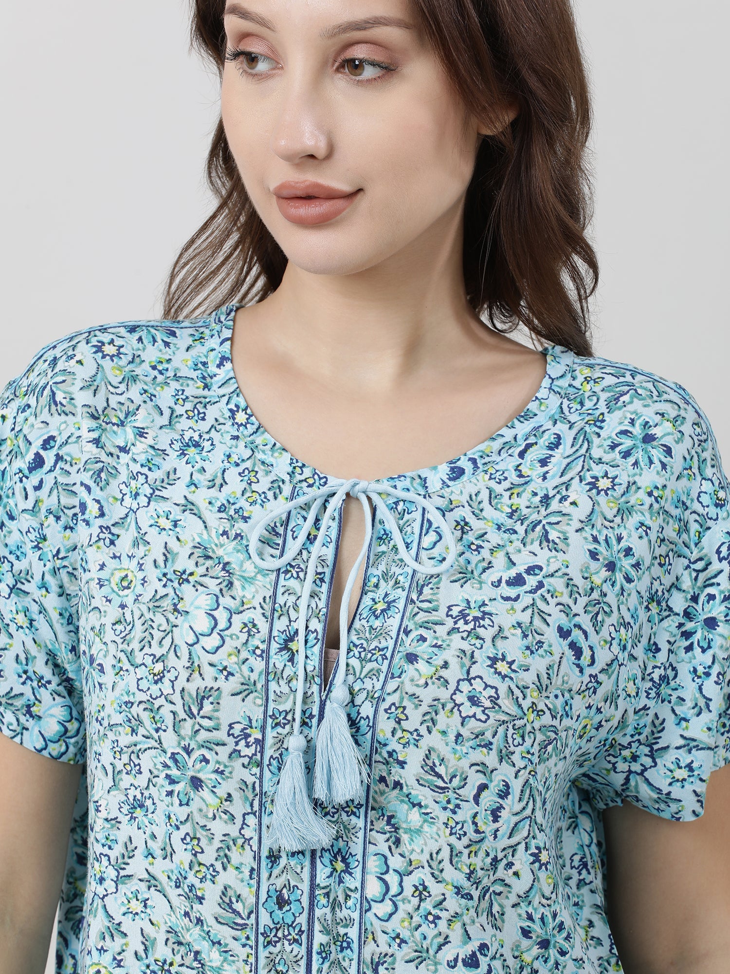 Elevate your summer loungewear with our light blue floral print tee. Featuring a neck tie-up, it's both pretty and comfortable.