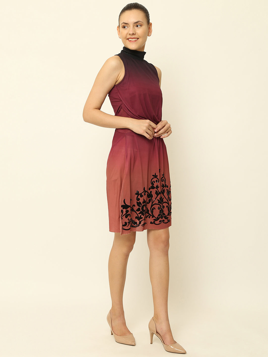 NoBarr's versatile, stylish, and flattering A-line Maroon Dress has a high neck, sleeveless design with pleat detail. Perfect for any occasion, pair with heels for a dressed-up look or flats for a casual yet stylish outfit. Made of fluid 94% Polyester and 6% Spandex with a 95% Polyester, 5% Spandex lining.