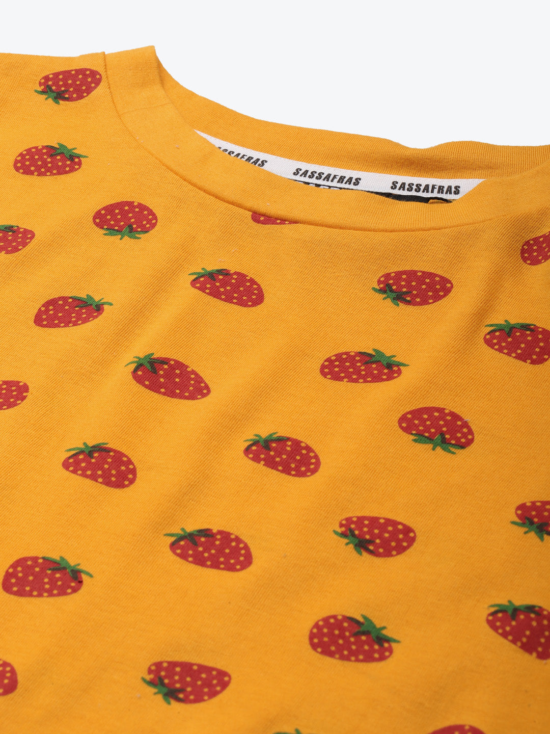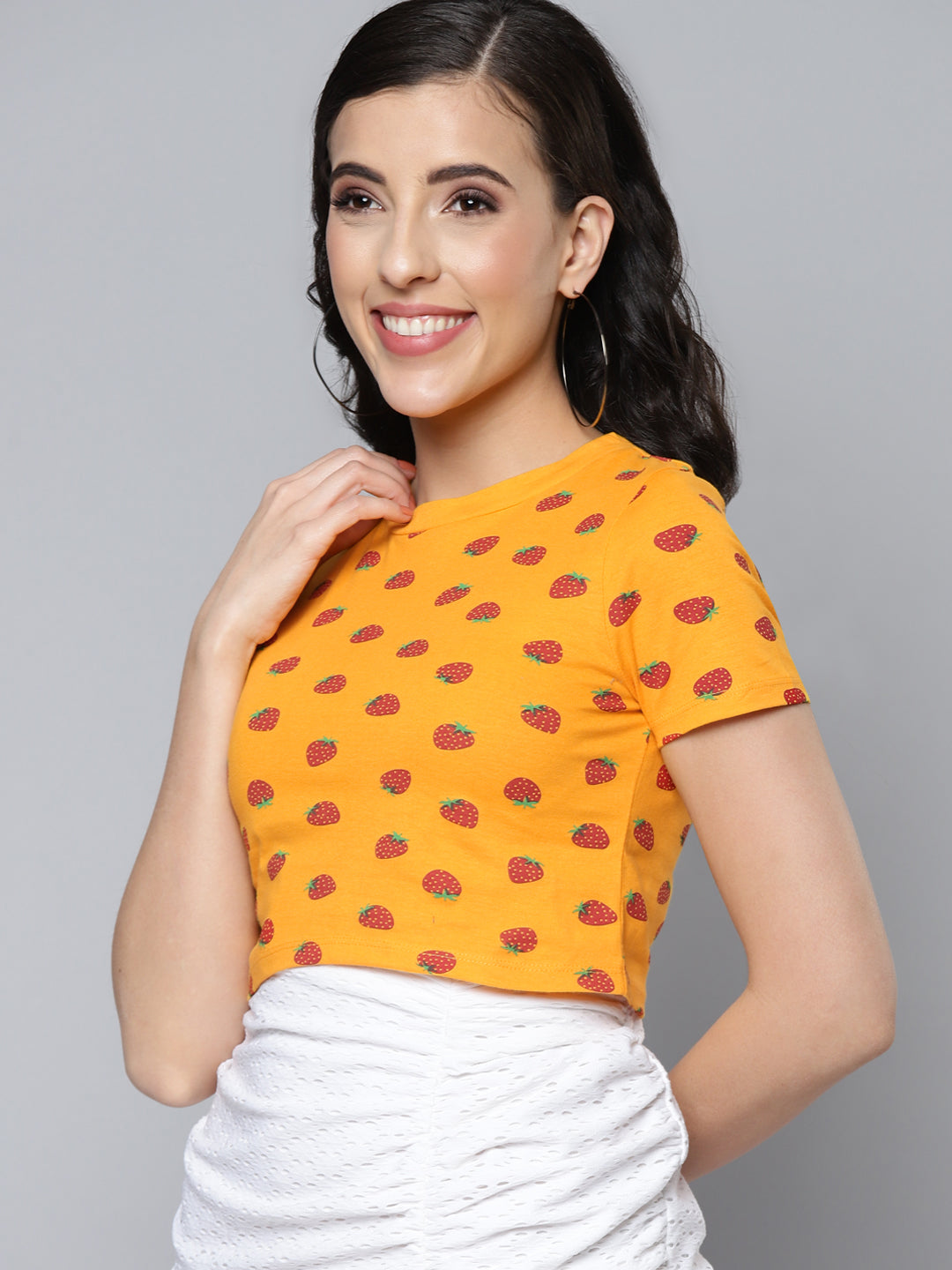 Mustard Strawberry Slim Fit Crop T-shirt , in Cotton Jersey fabric, Unlined, Crop Length, Comfort Fit, No Closure, Straight Hemline and features Print All Over