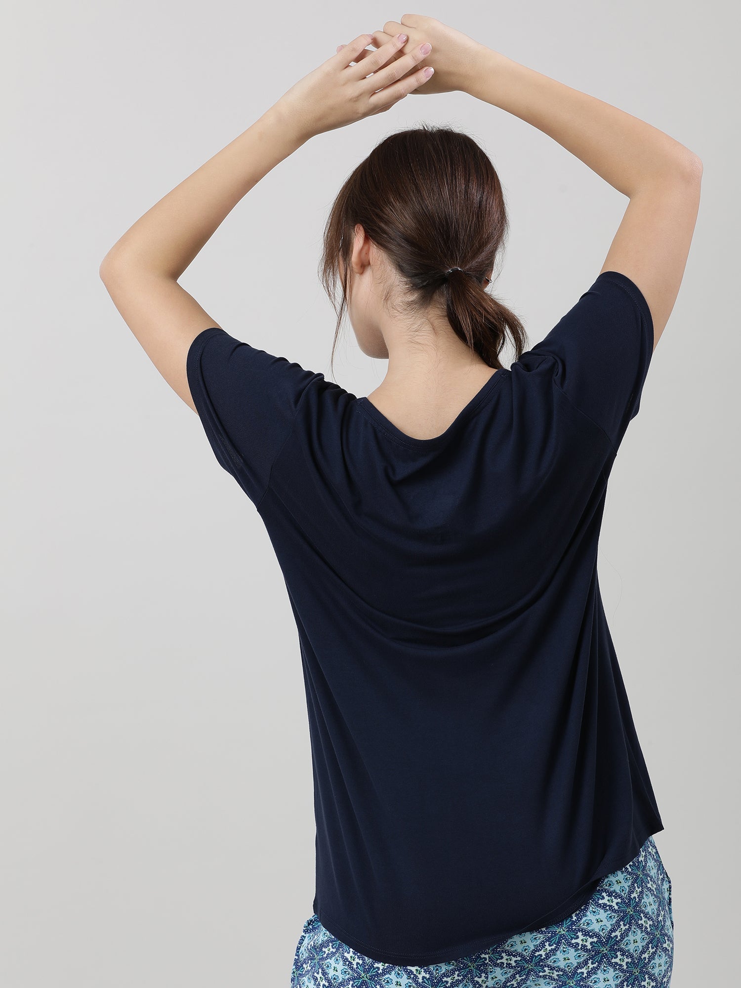 Effortlessly cool navy blue round-neck tee with short sleeves, perfect for casual days and versatile styling.