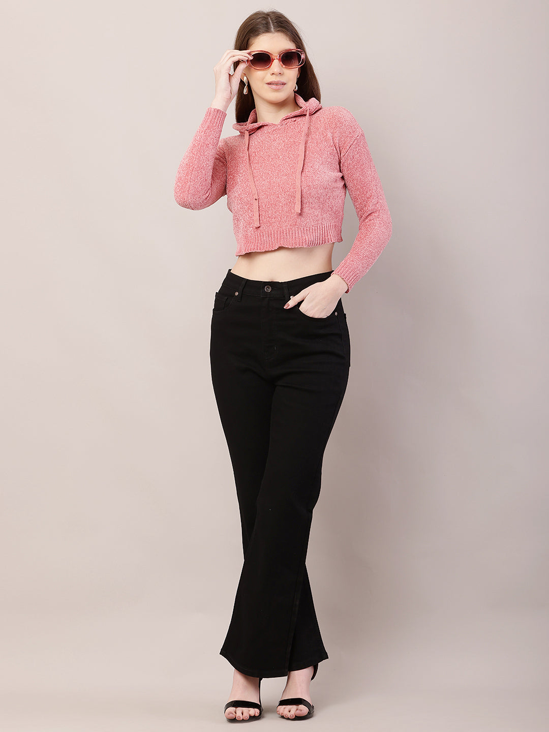 Women peach polyester full sleeve hooded cropped sweatshirt