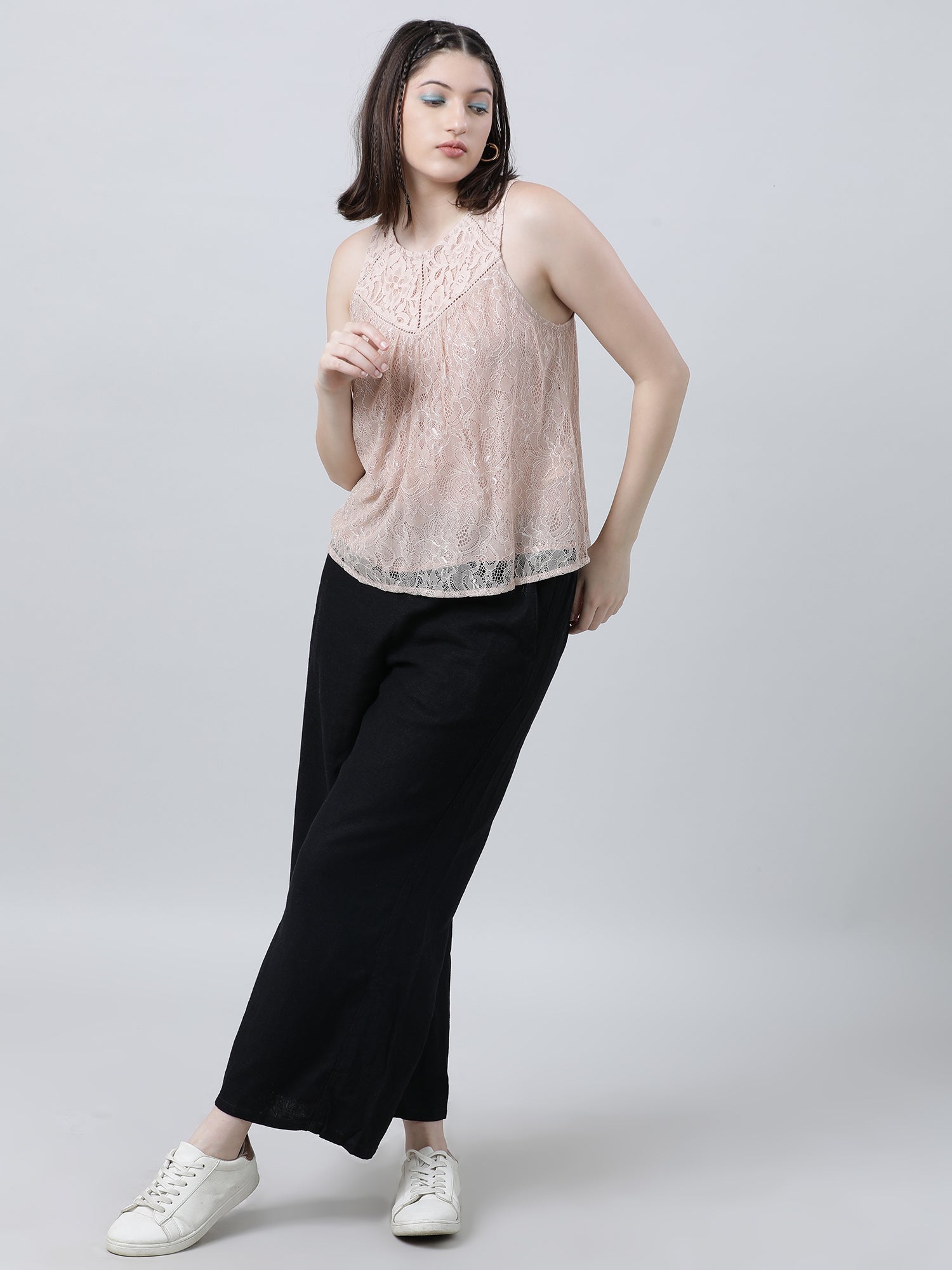 Exude timeless elegance in our women's regular fit cream lace sleeveless top, epitomizing feminine grace with effortless sophistication.
