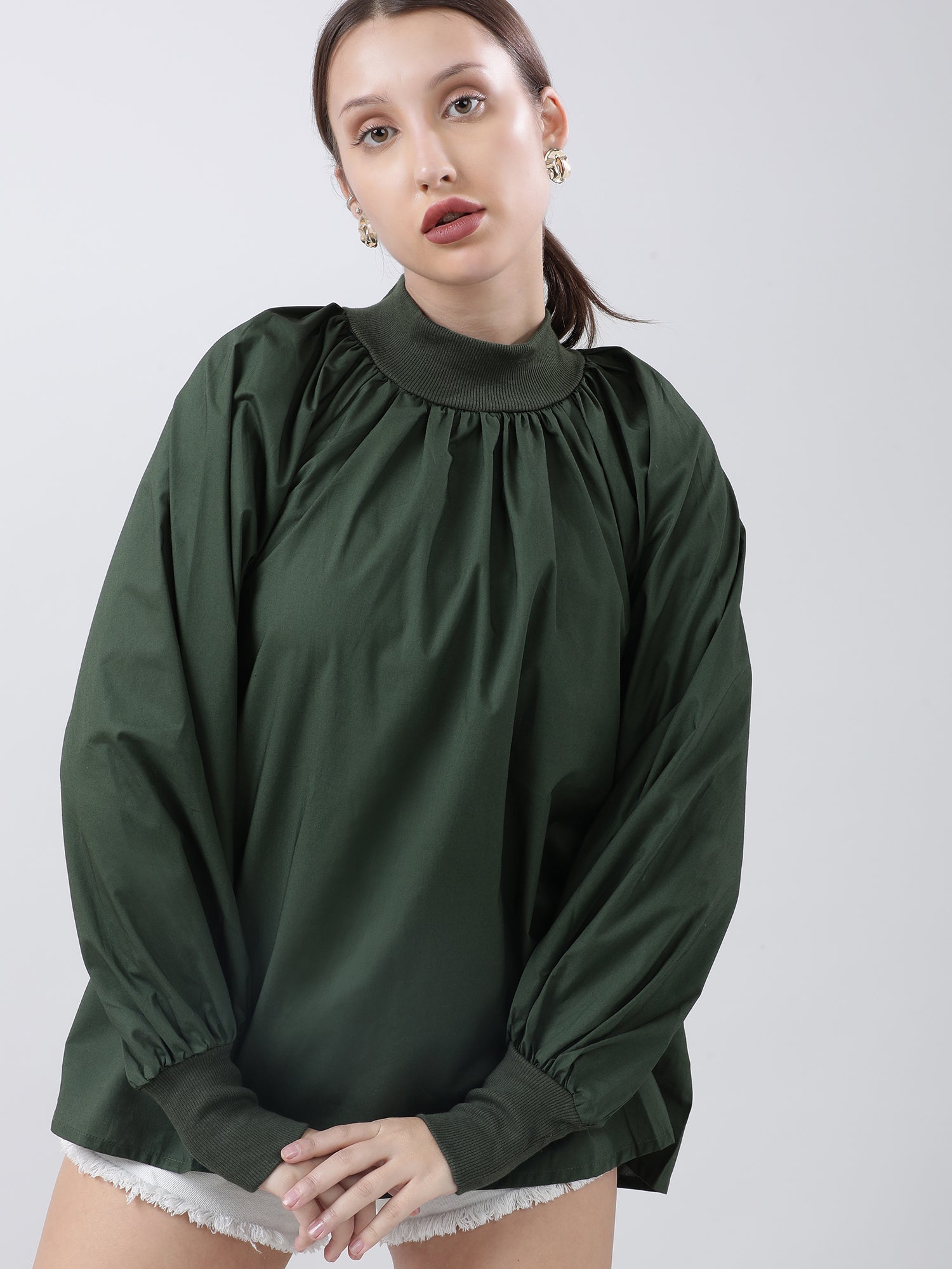 Transform your look with this unconventional green high-neck top, marrying edgy puffed sleeves with a relaxed, yet stylish fit.