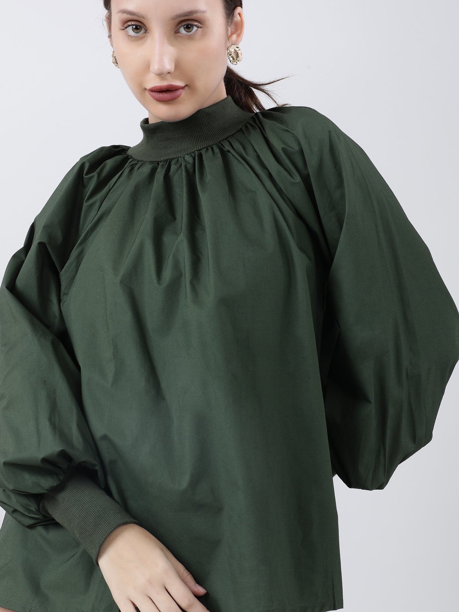 Women Regular Fit Green High Neck Top With Puffed Sleeves