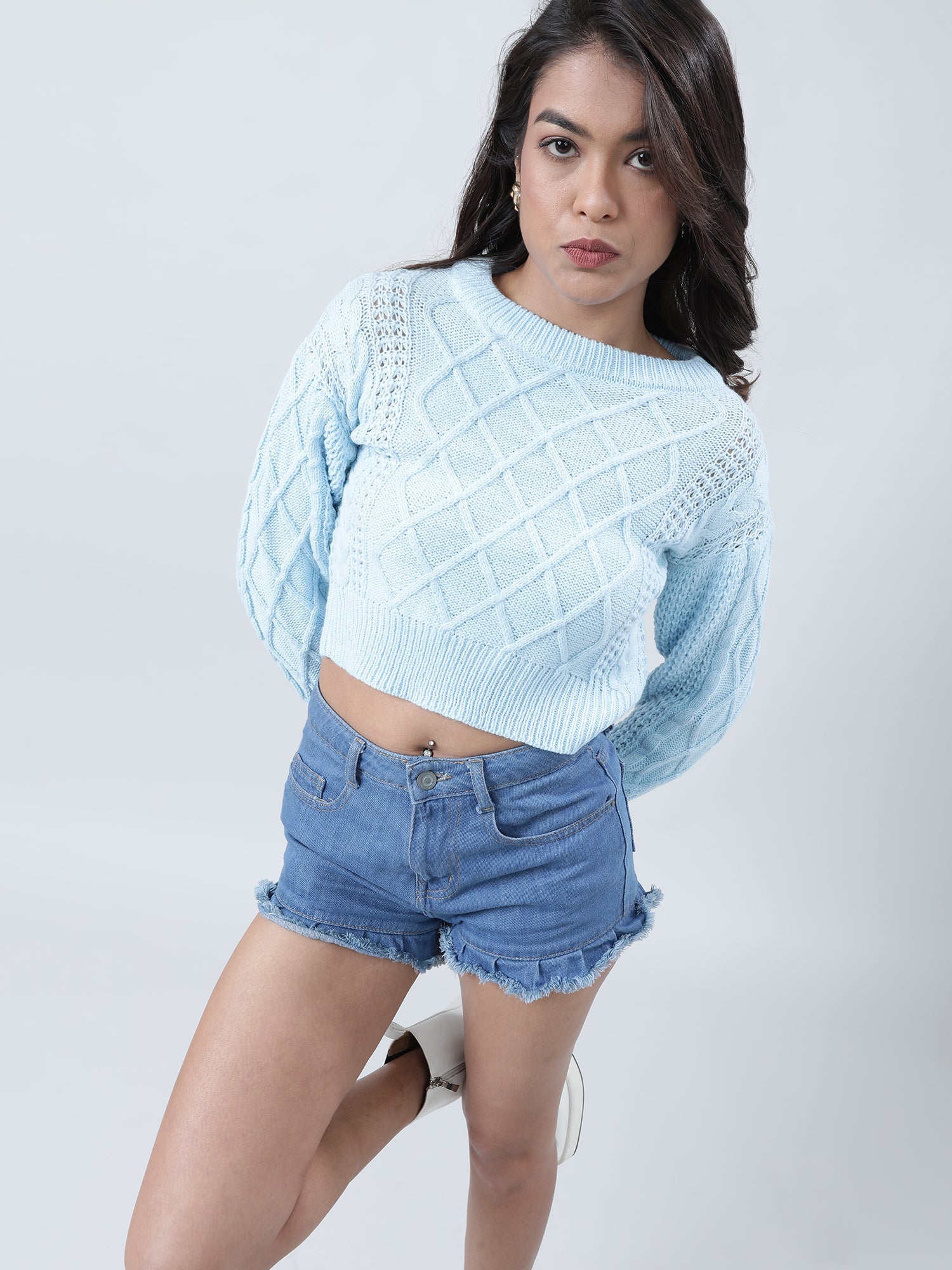 Modernize your wardrobe with this cropped light blue sweater, blending comfort and style for the contemporary women's everyday elegance