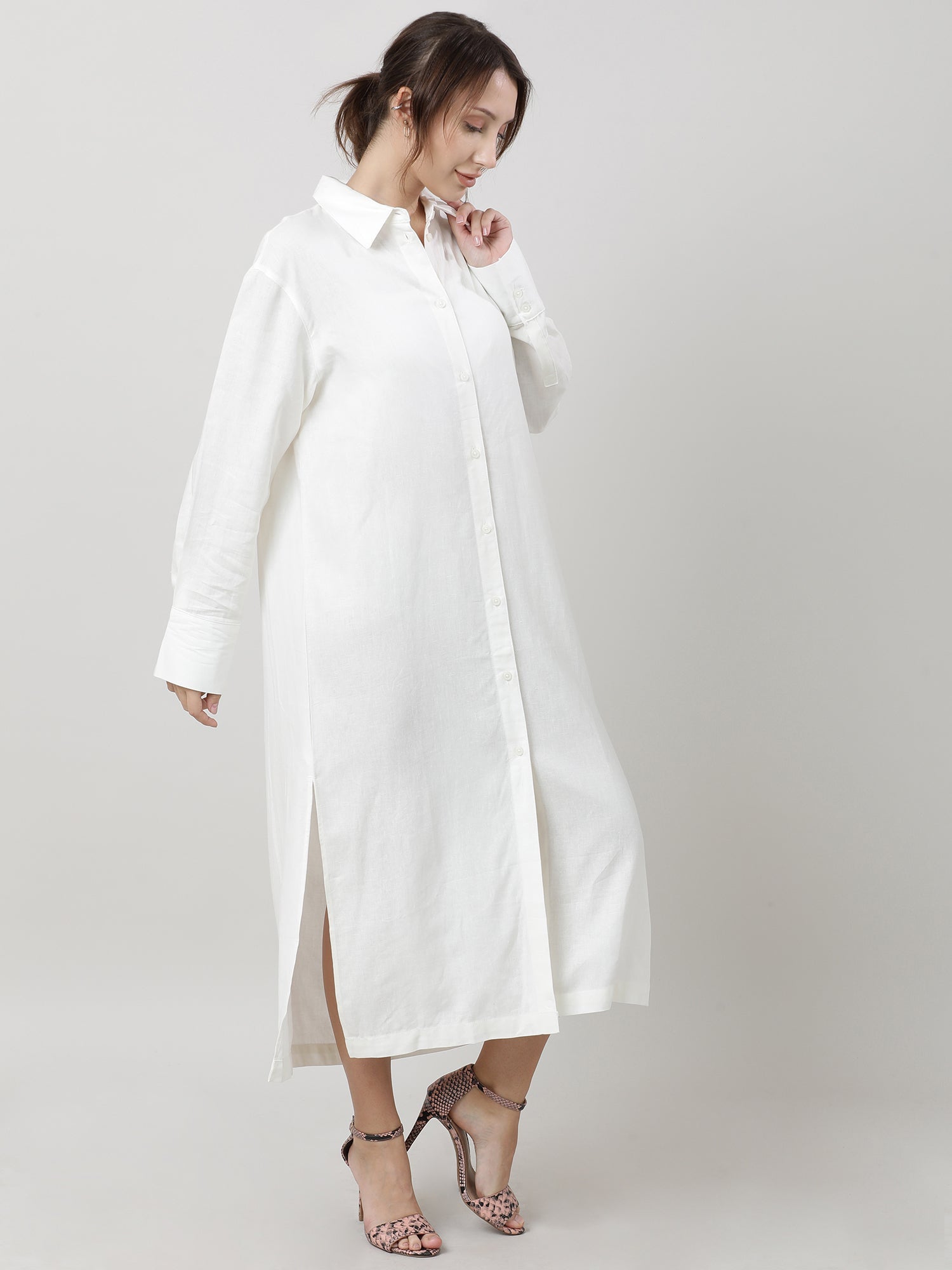 Chic simplicity: white shirt dress with a spread collar, exuding effortless style and timeless elegance for any fashion-forward woman.