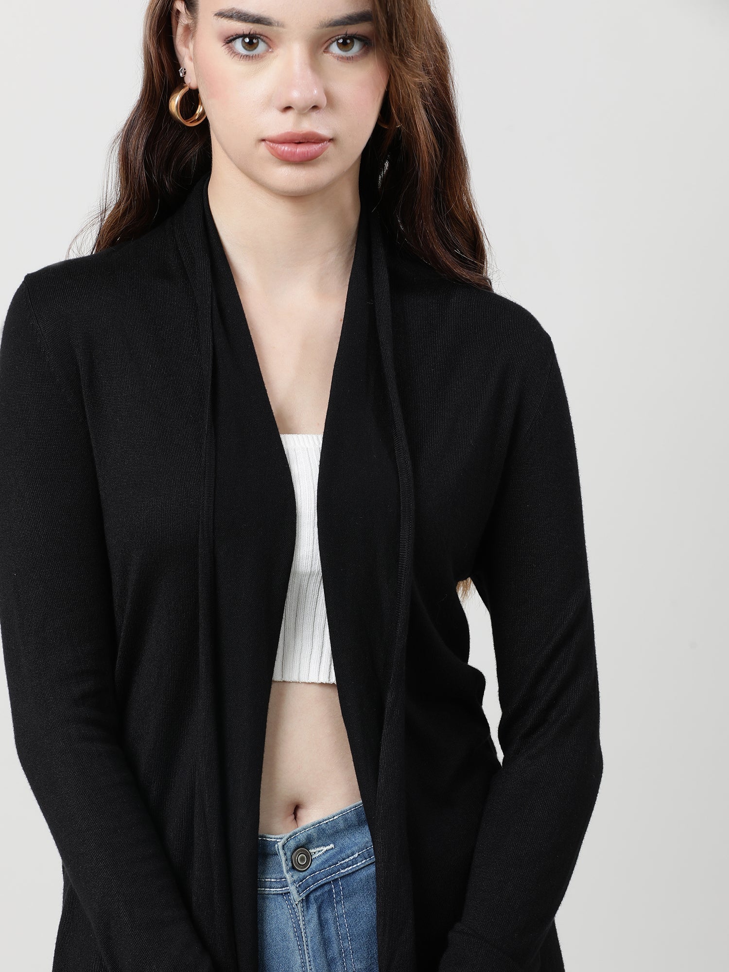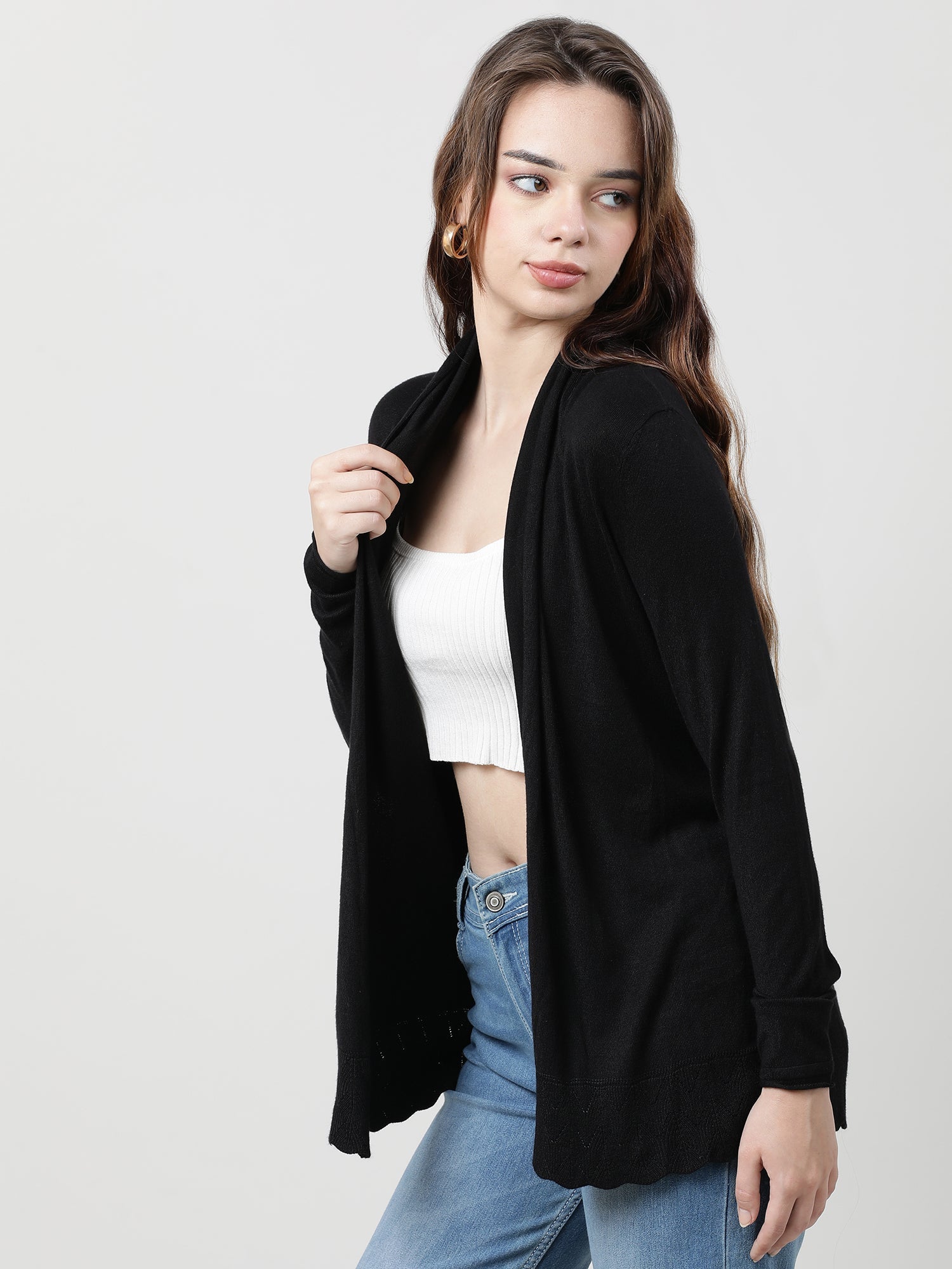 Presenting our Women's Relaxed Black Full Sleeve Shrug, the ideal fusion of style and comfort. Any outfit is made more elegant by this front-open shrug, which is embellished with tiny laces at the bottom and solid lace throughout. With this adaptable item, you can effortlessly combine comfort and stylish accents for a sophisticated appearance that will elevate your style.