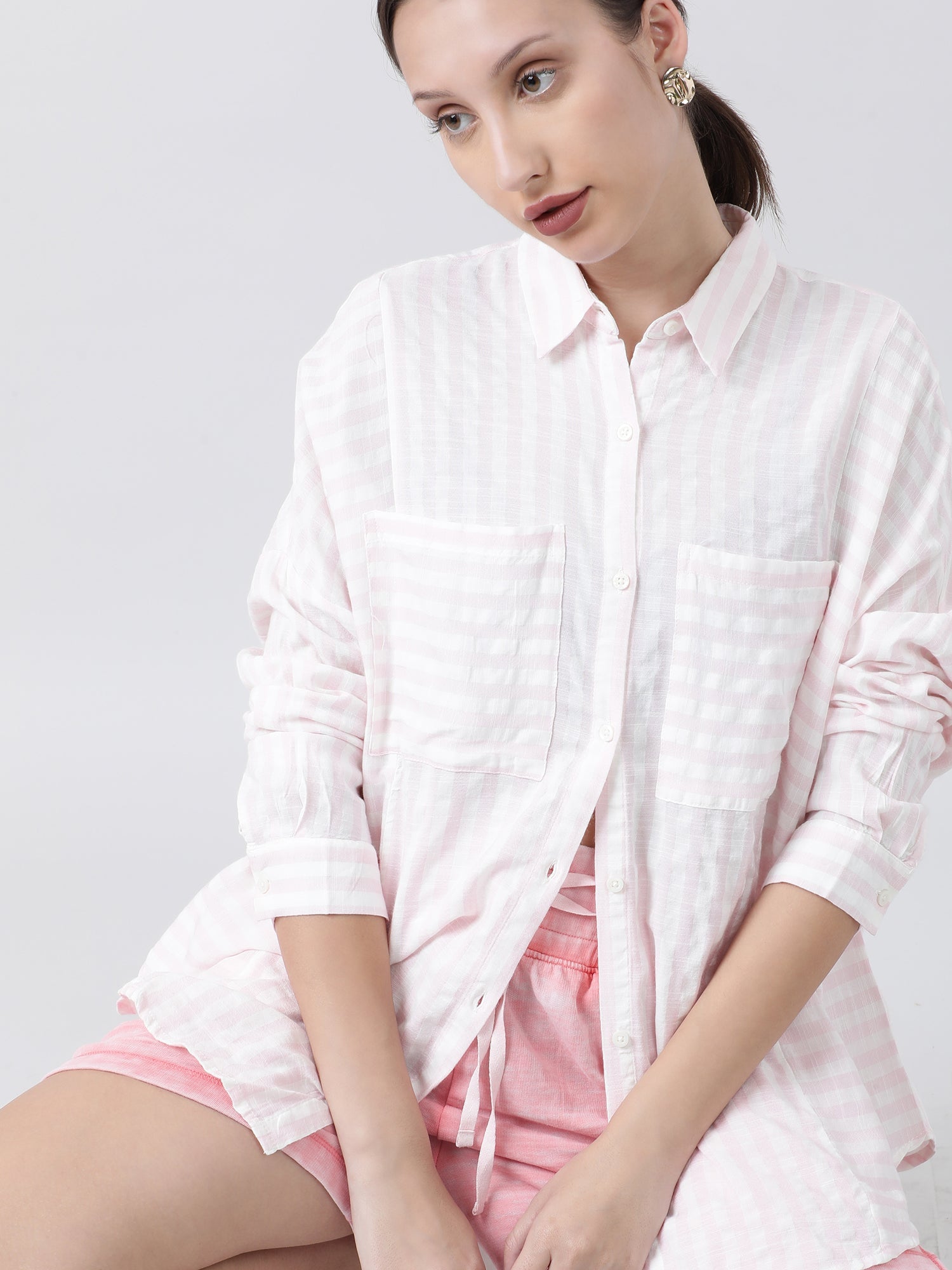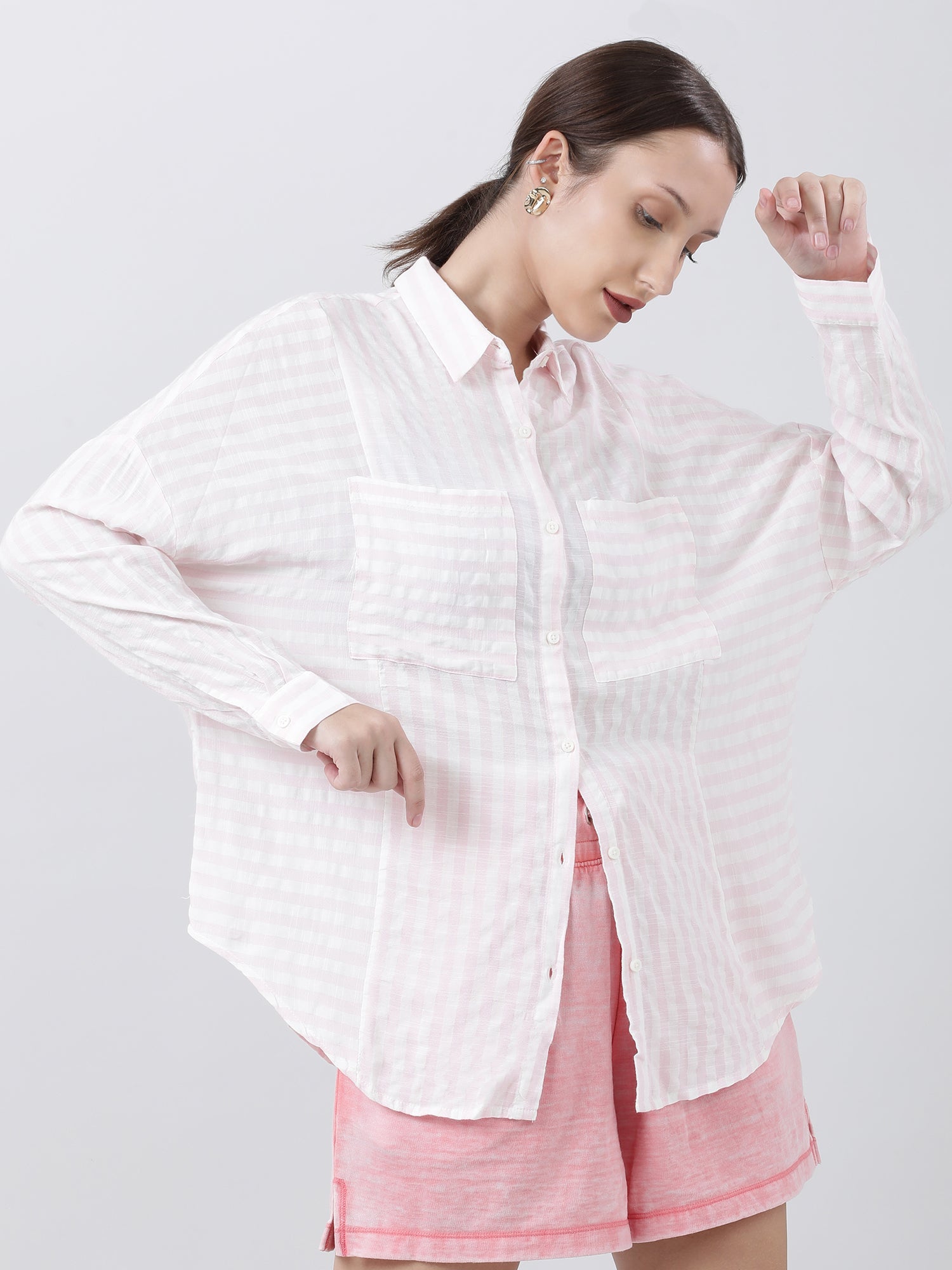 Indulge in casual elegance with our women's relaxed fit pink shirt, adorned with charming stripes for a feminine touch.
