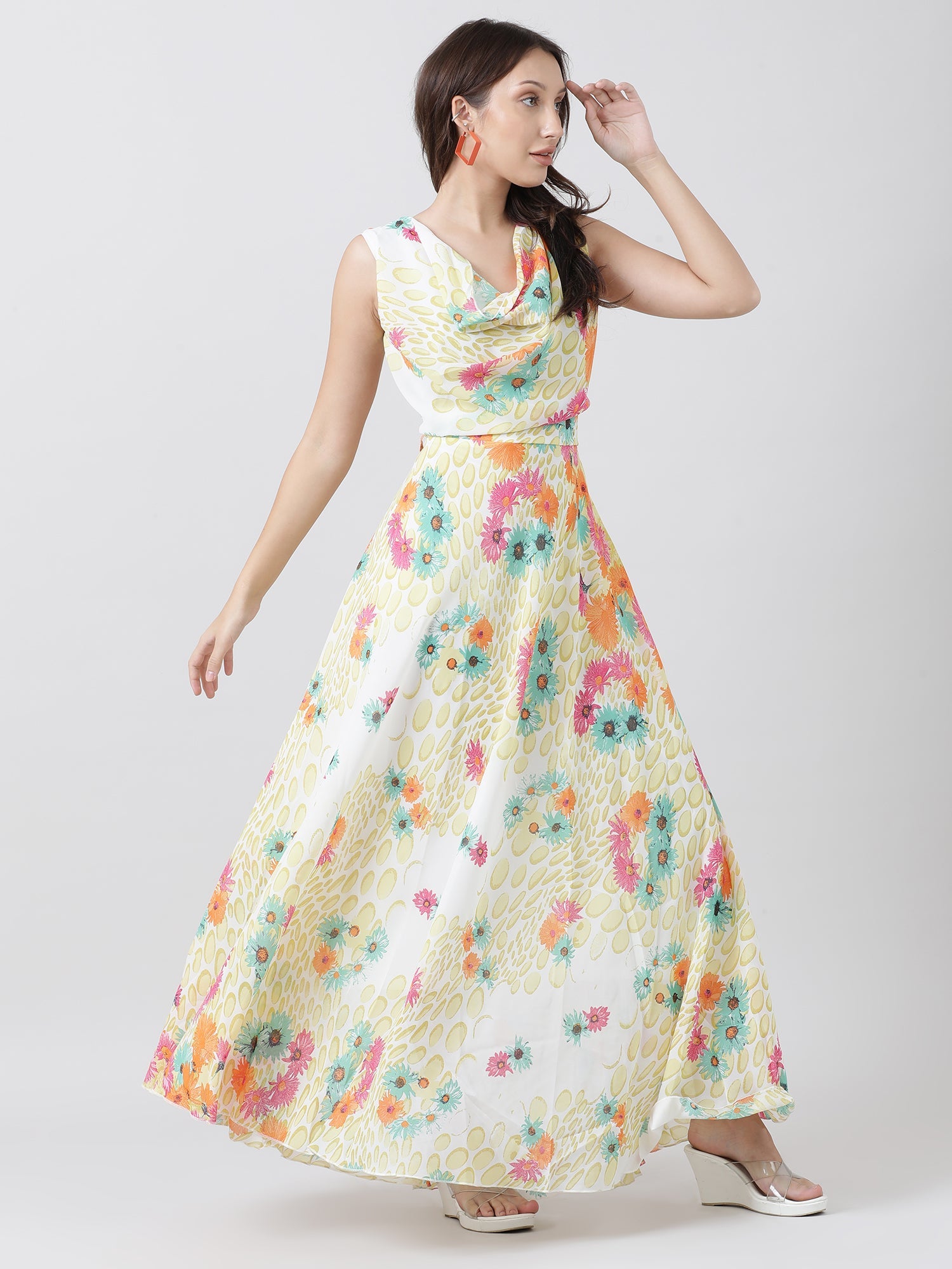 Indulge in the floral charm of our flowing yellow maxi dress adorned with an all-over floral print.