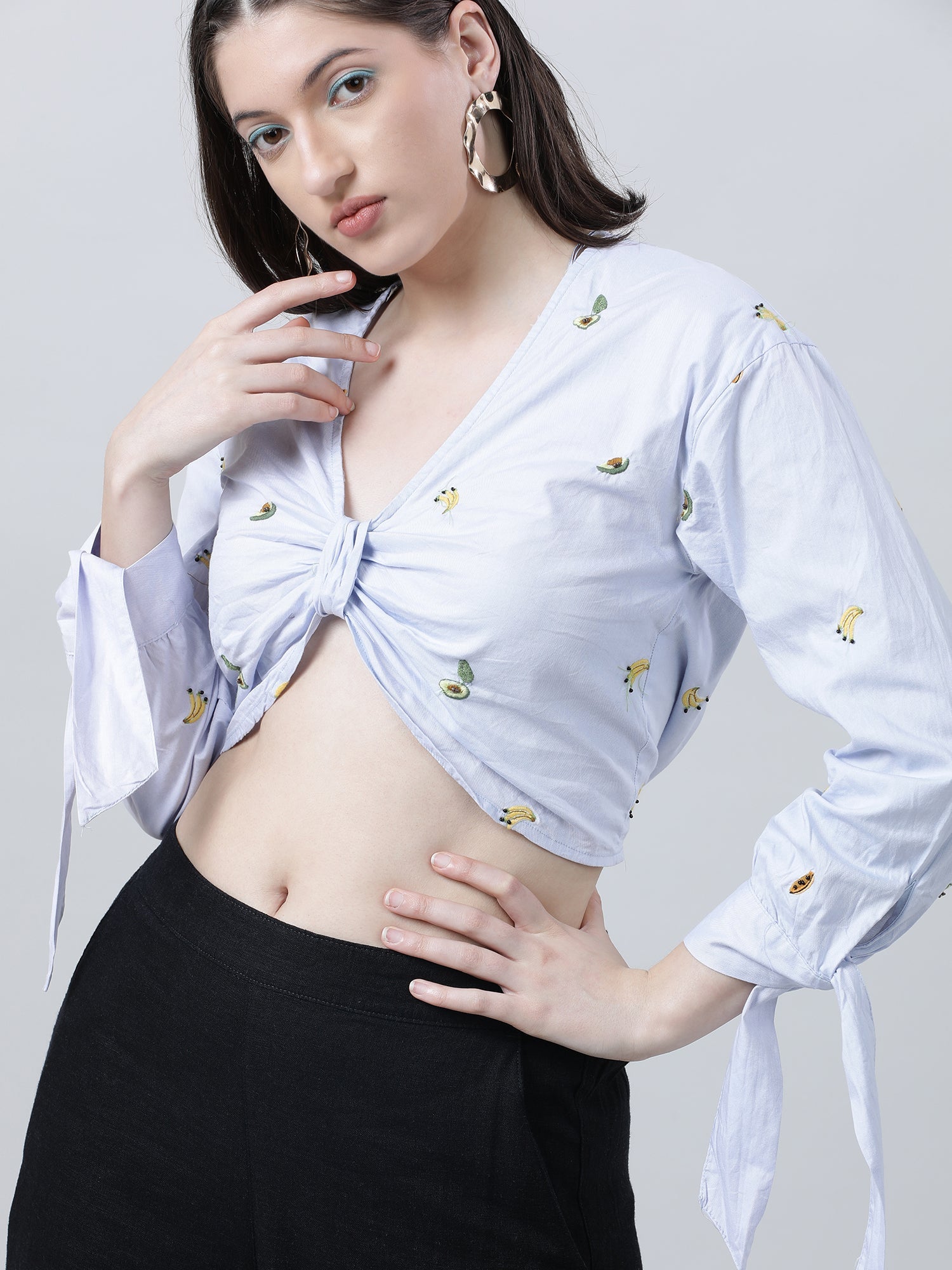 Graceful and feminine, this light blue top features intricate embroidery and tie-ups, offering a slim fit for a touch of timeless elegance.