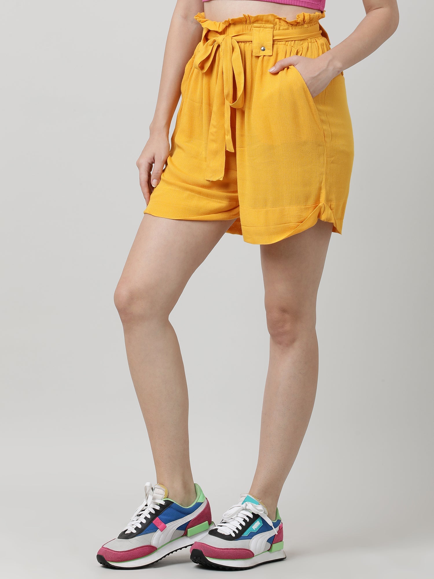 Enhance your wardrobe with these bright yellow paper-bag waist pants with insert pockets, boasting a regular fit for endless summer.