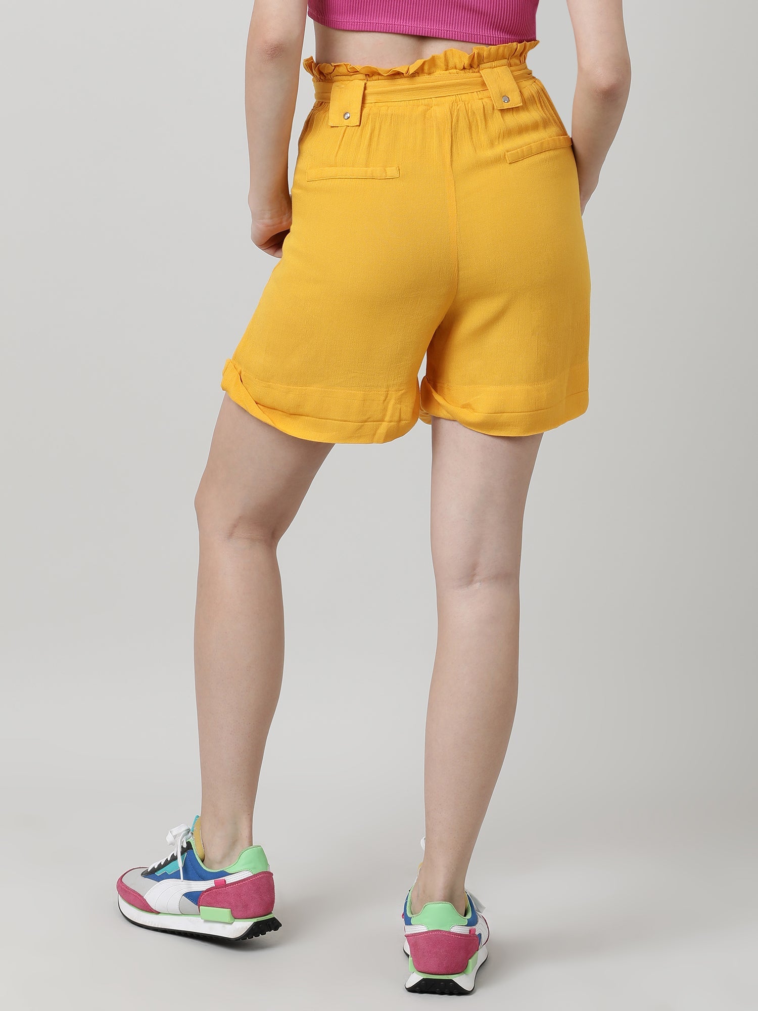 Women Slim Fit Yellow Paper Bag Shorts With Belt