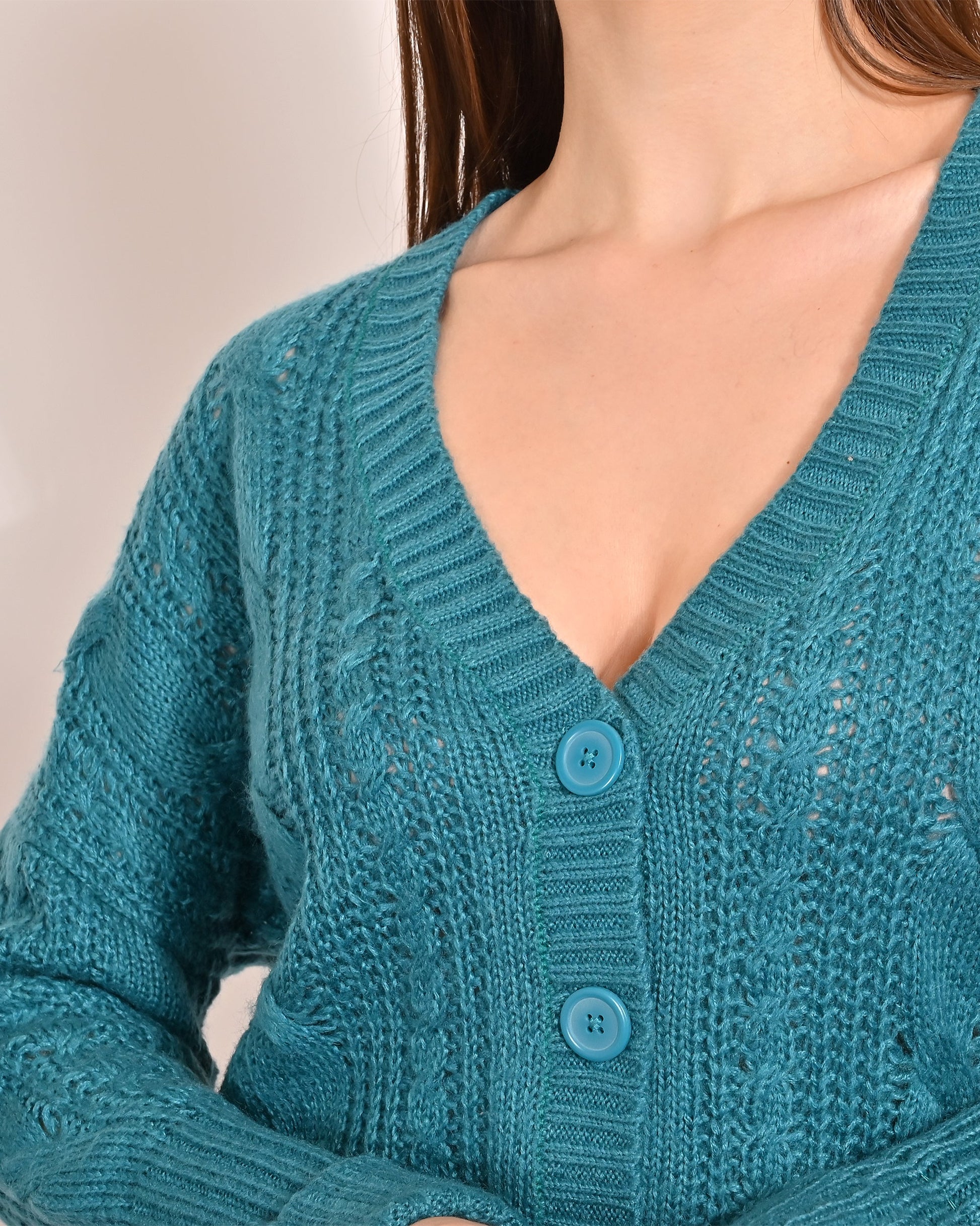 NoBarr Turquoise color cardigan in a soft Cable knit containing some wool with a V-neck and buttons down the front. Dropped shoulders, long sleeves and ribbing at the cuffs and hem. Made Of 100% Acrylic