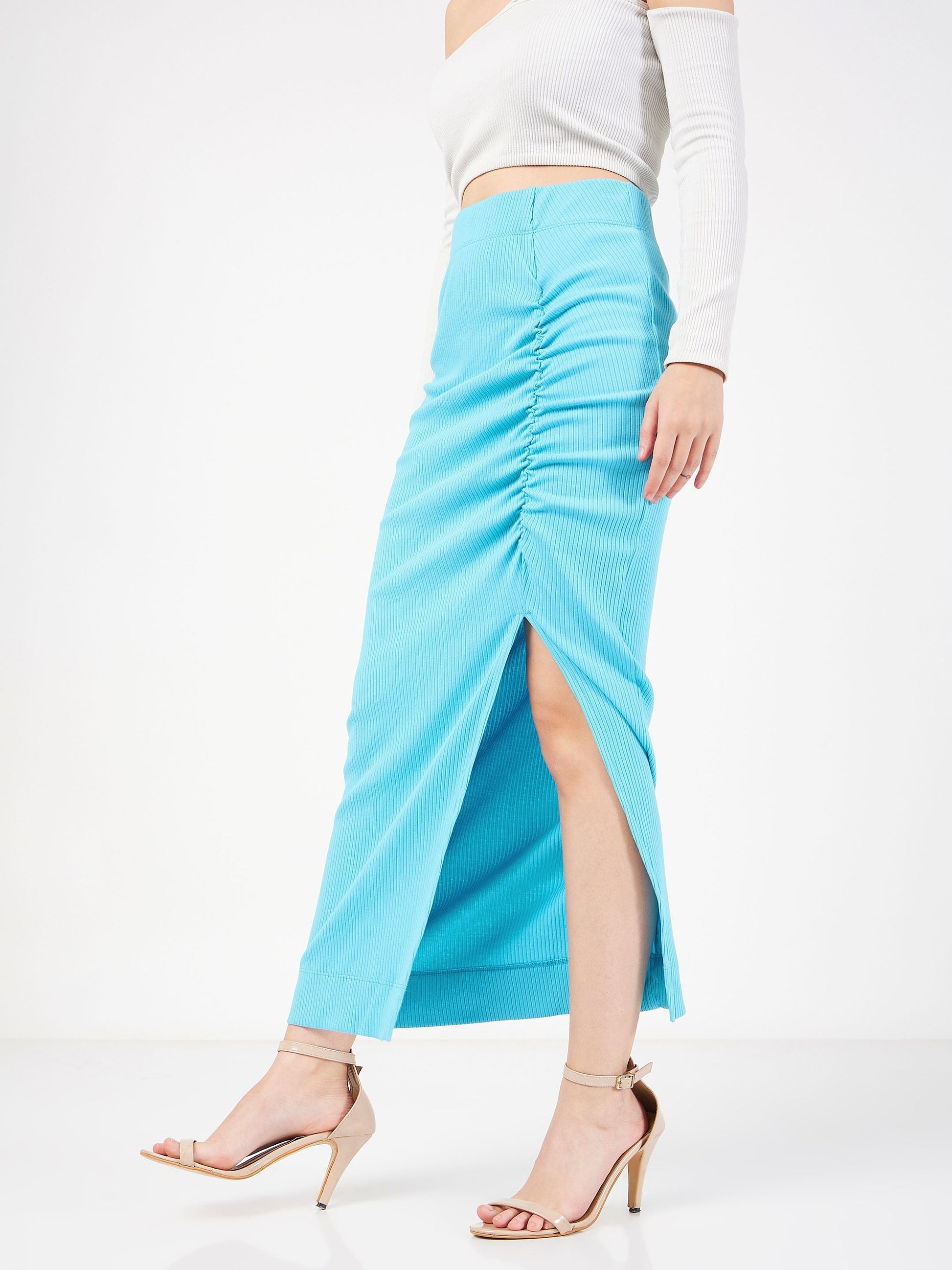 Women Turquoise Rib Front Ruched Midi Skirt