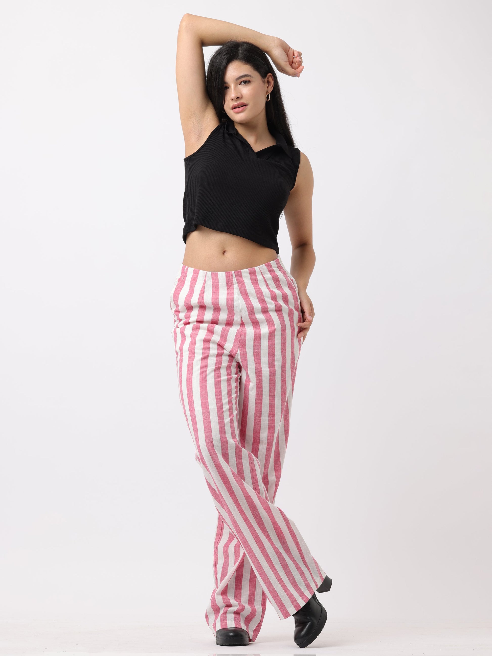 Step into the season with the women’s white & pink vertical stripe pants, offering a fresh and modern look.