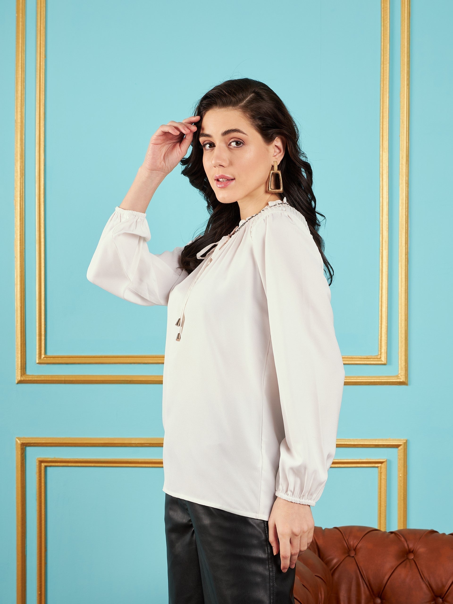Women White Puff Sleeves Embellished Top