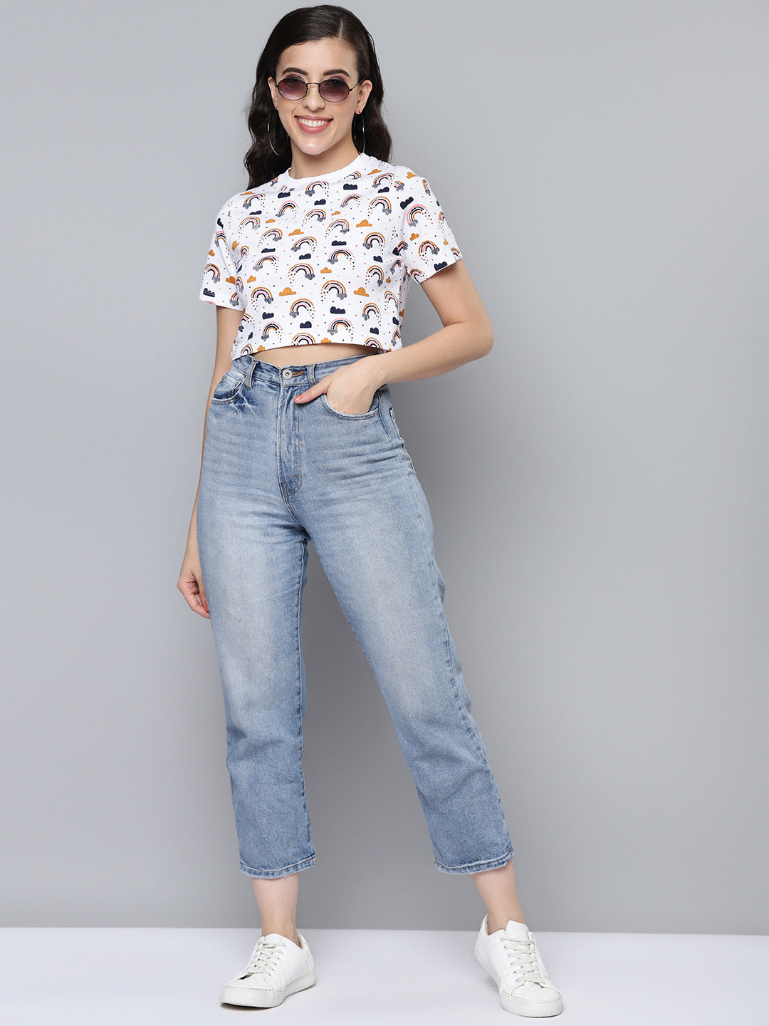 White Rainbow Slim Fit Crop T-Shirt, in Cotton Jersey fabric, Unlined, Crop Length, Slim Fit , No Closure, Straight Hemline and features Print All Over