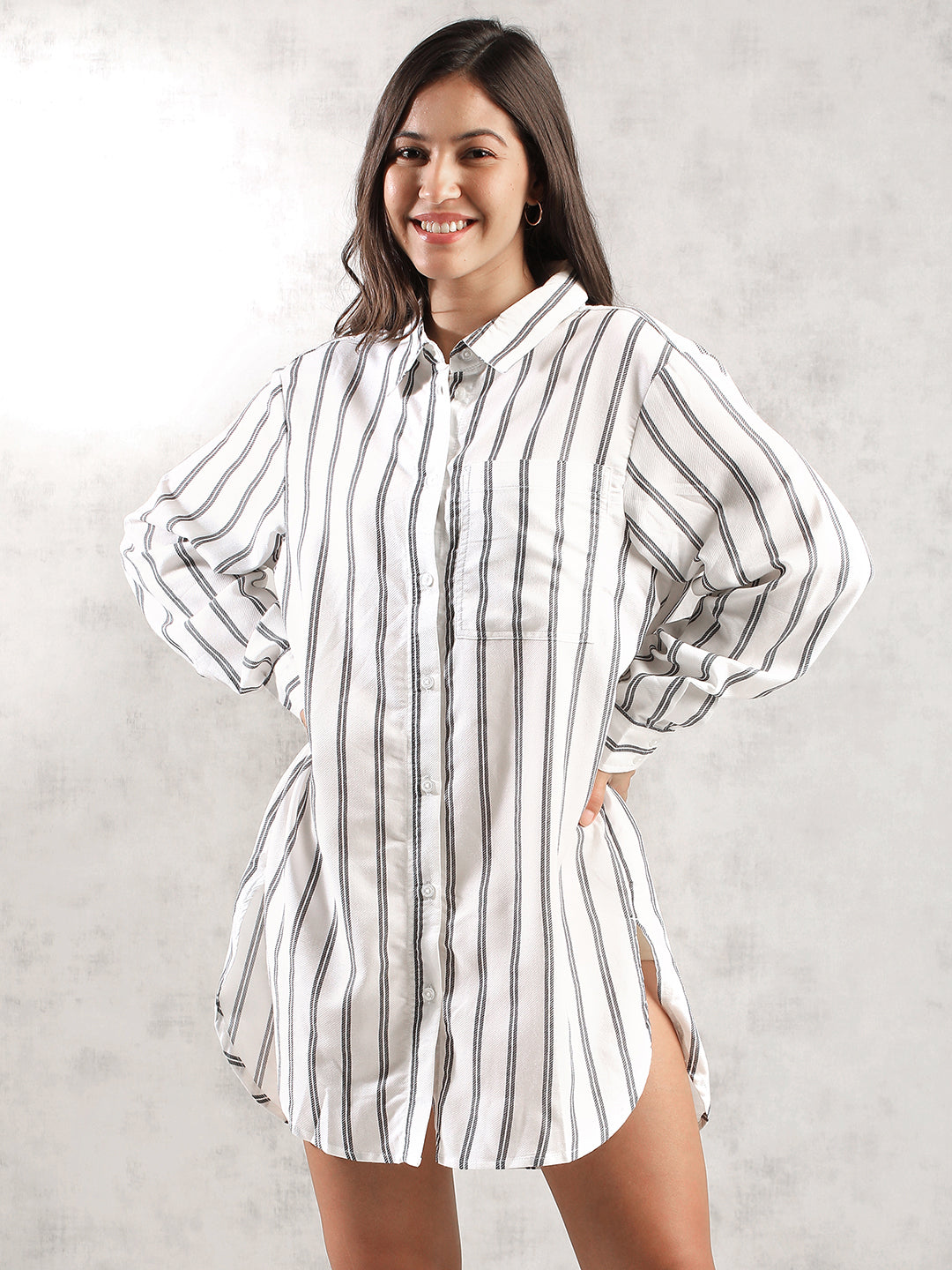 Stripes for days! This white regular fit shirt with printed stripes and a shirt collar is a wardrobe essential. Full sleeves for a classic look.