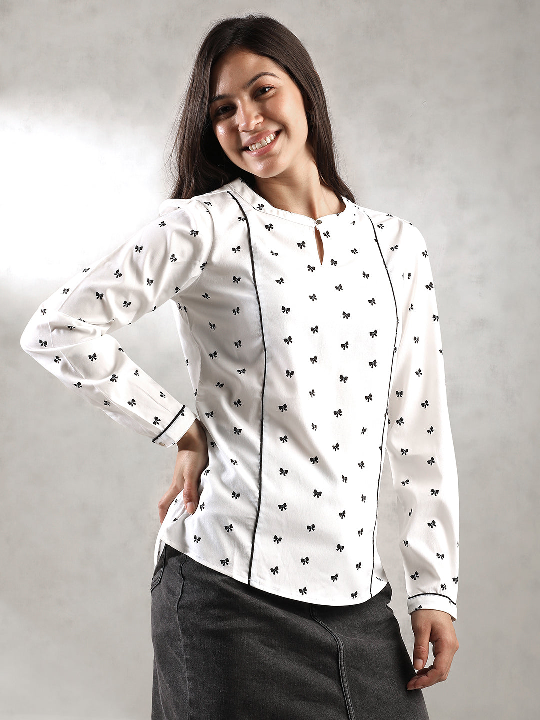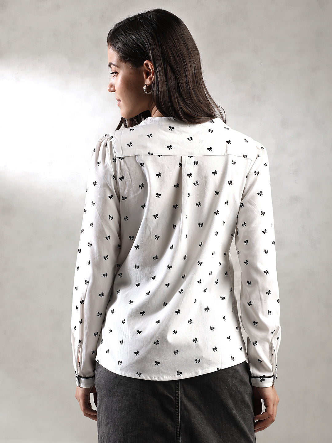 Women White Regular Fit Tops in White with a Printed Crepe pattern. Features a regular fit, front button closure, round neck, and full sleeves.