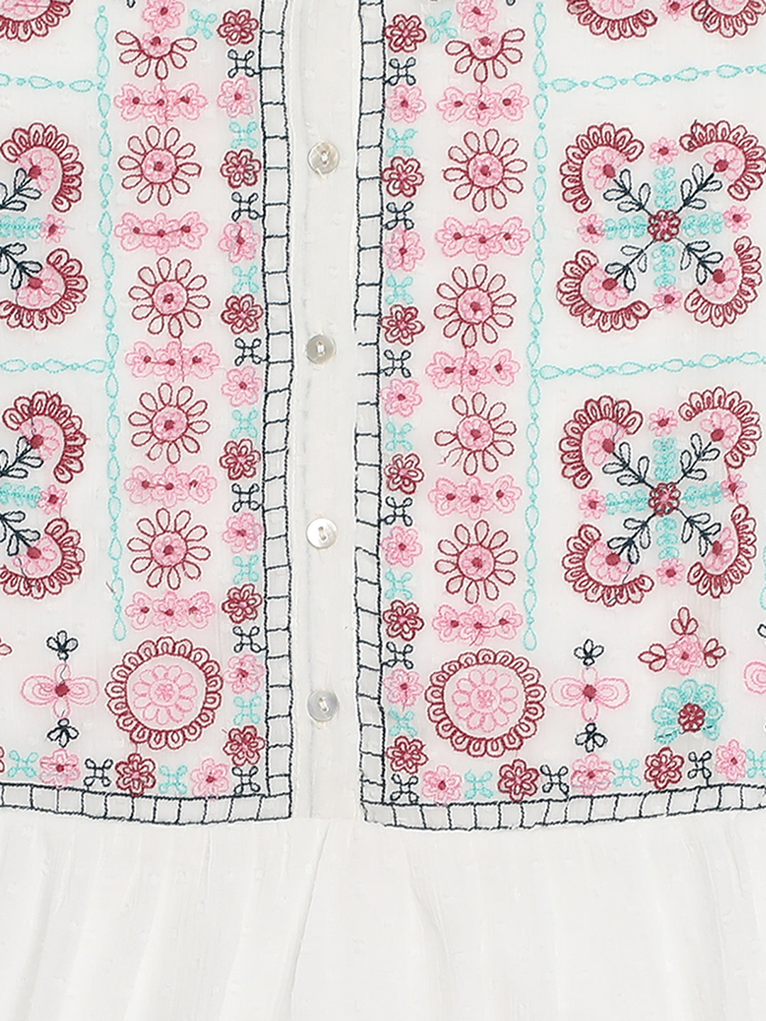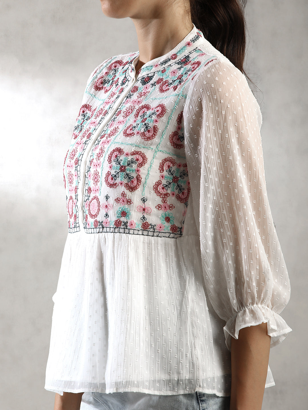 Upgrade your wardrobe with this versatile Women's White Regular Fit Top. Its Chiffon Dobby material and textured design add style to any outfit. With a classic Mandarin collar and three-quarter sleeves, this top is a fashion must-have.