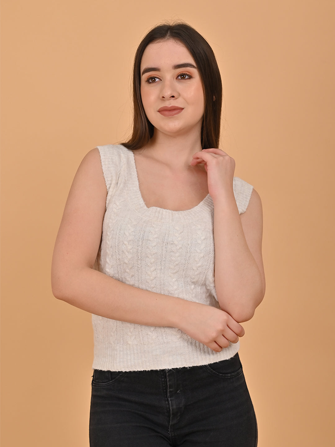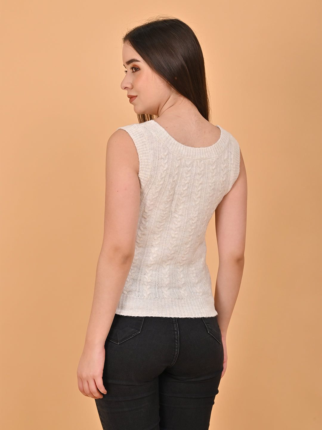 The NoBarr Women White Polyester Sleeveless Sweater embodies casual sophistication with its timeless design and comfortable construction. Crafted from a Polyester, this sweater offers a lightweight and breathable feel, making it perfect for layering or wearing alone during transitional seasons. The sleeveless silhouette adds versatility to your wardrobe, allowing you to effortlessly pair it with skirts, shorts, or trousers for a chic and relaxed look. Whether you're running errands or meeting friends for brunch, this sweater provides a stylish and effortless option. With its classic yet contemporary aesthetic, it's sure to become a staple piece in your wardrobe rotation, offering both comfort and style for any occasion. Made of 34% Polyester, 34% Acrylic and 32% Spandex