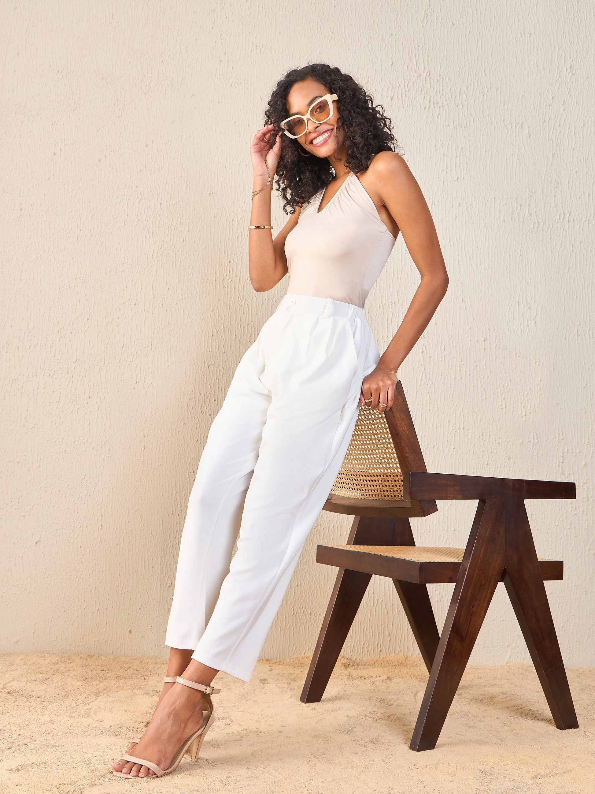 White Tapered Pants, In Canton Knit Fabric, Pleats Detail At Front, Knitted, Straight, Fabric, Canton Knit Hemline And Features Pleats Detail At Front