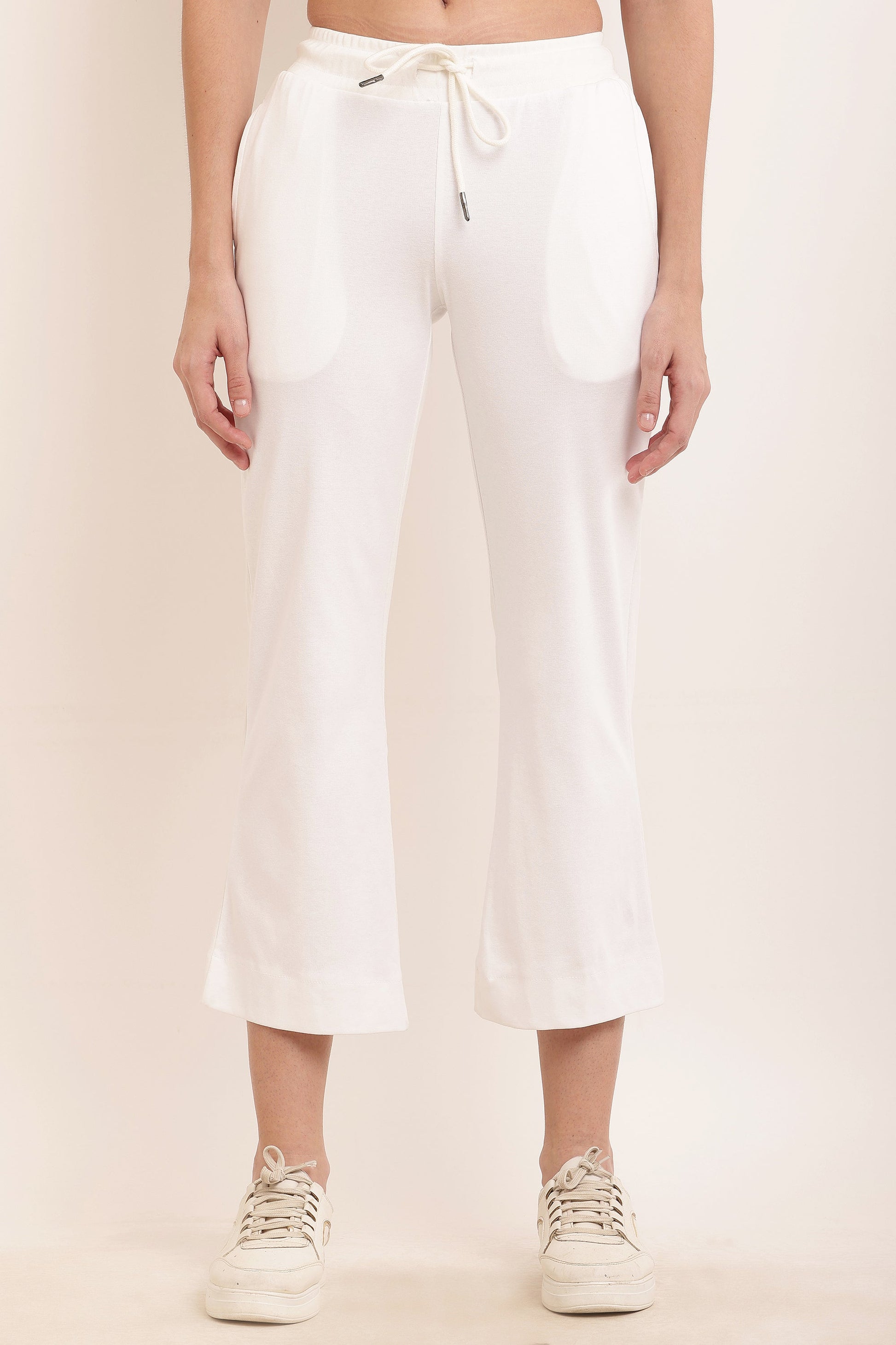 Regular fit Ankle-length trousers pant. A pair of White solid woven wide leg Trouser has a partially elasticated waistband, drawstring closure.